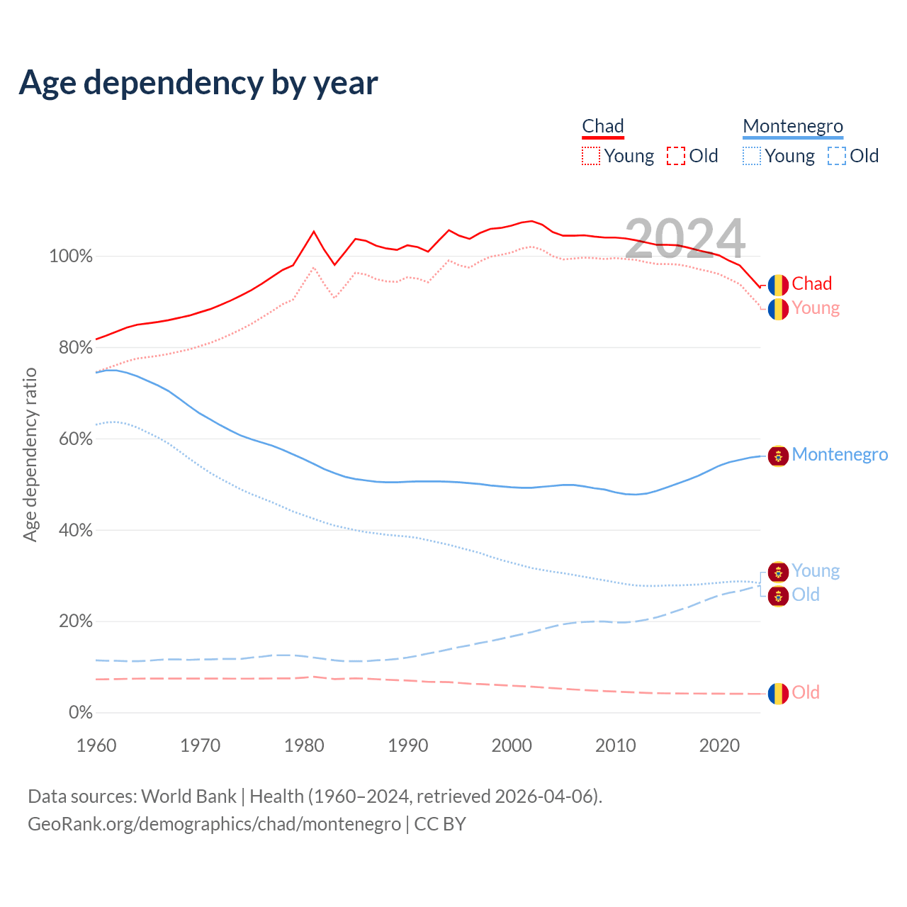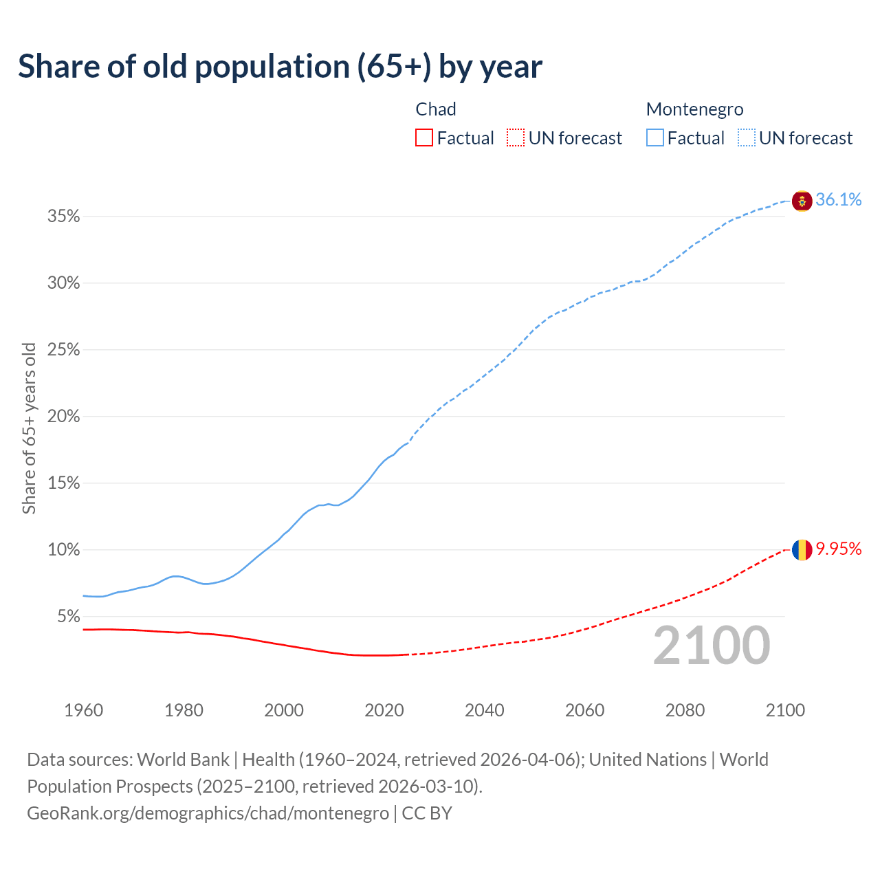 - The share of old-age demographic (65+) in Chad is 2.1% vs 17.8% in Montenegro.