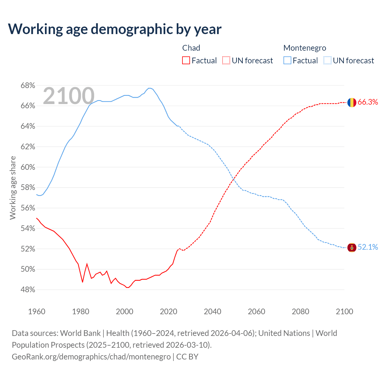 - The share of young demographic (0-15 years old) in Chad is 46.1% vs 18.1% in Montenegro.