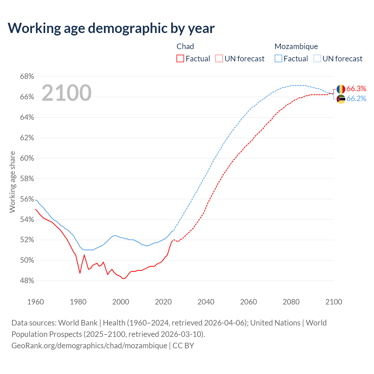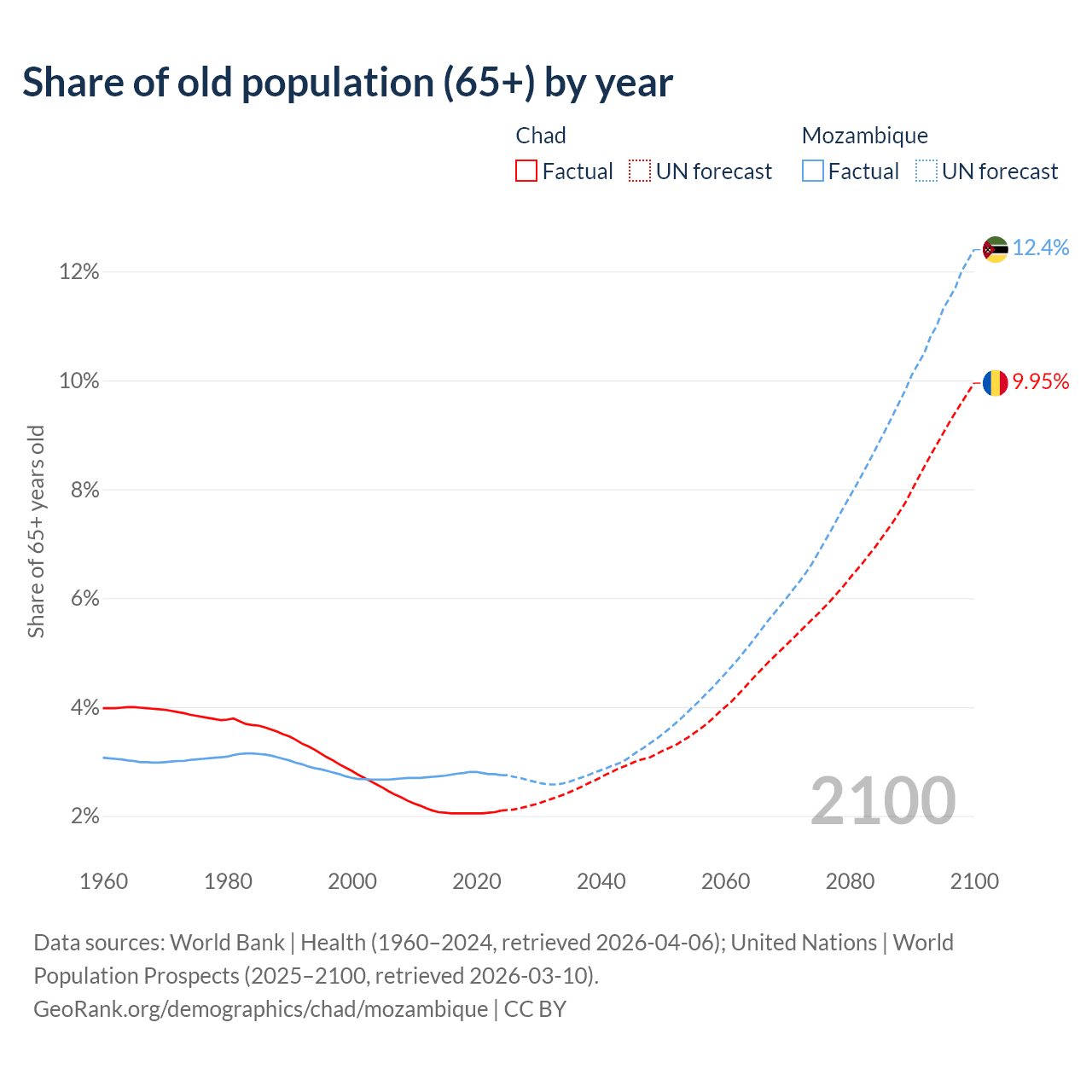 - The share of old-age demographic (65+) in Chad is 2.1% vs 2.75% in Mozambique.