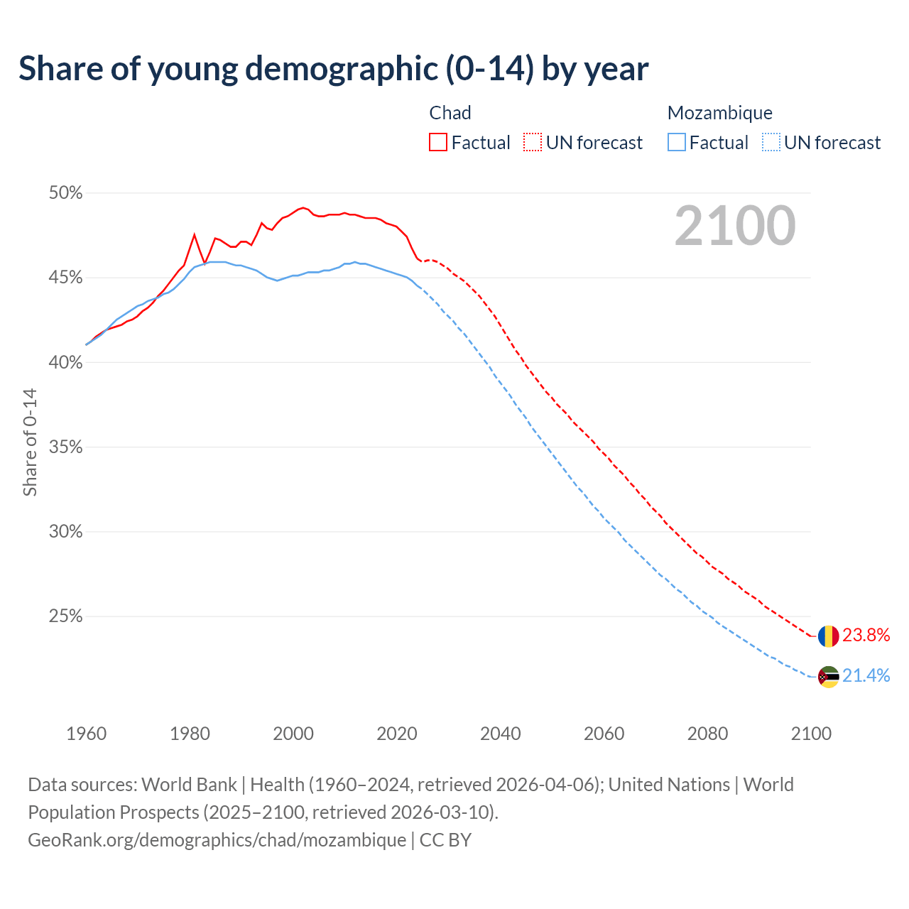 - The share of young demographic (0-15 years old) in Chad is 46.1% vs 44.5% in Mozambique.