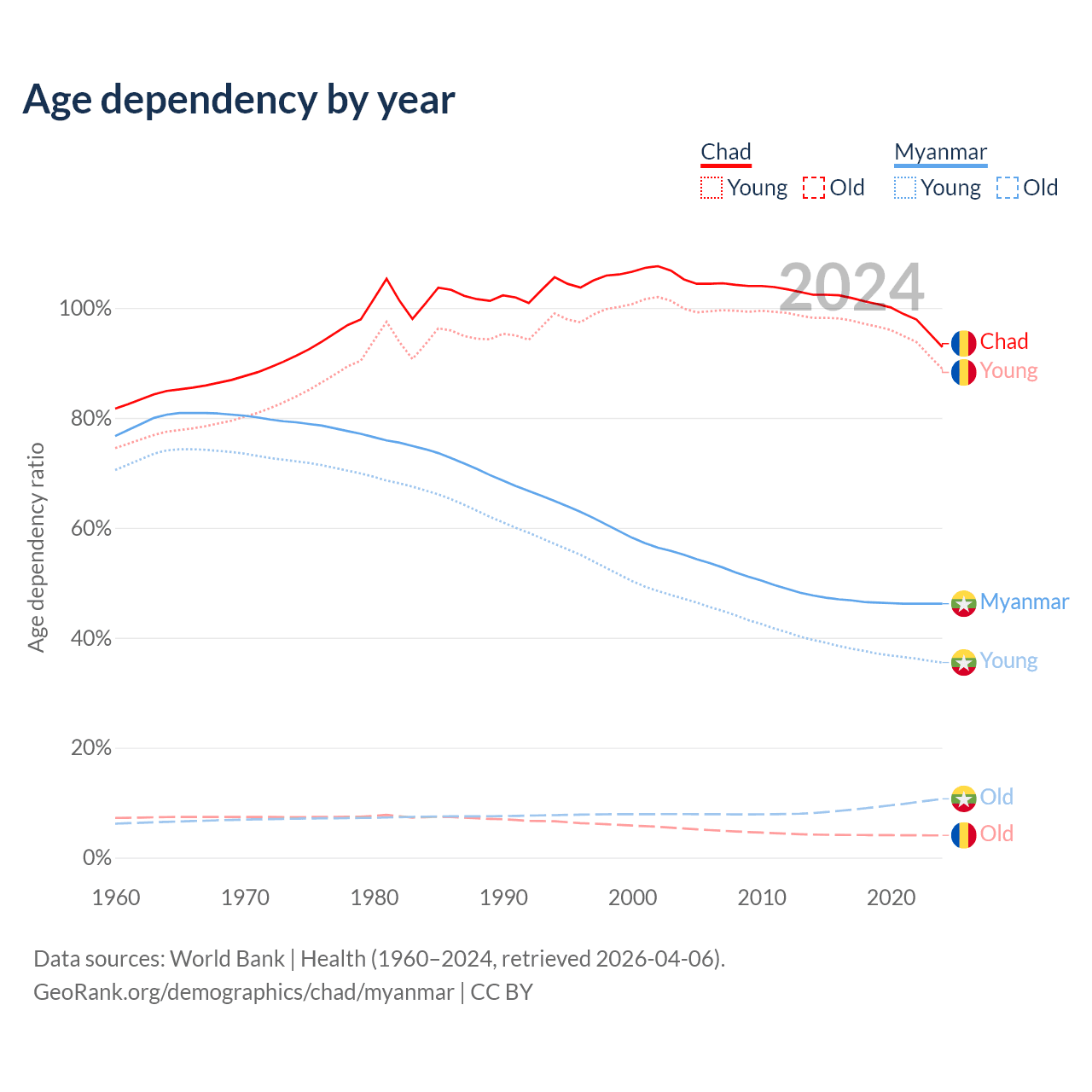 - Chad is ranked 192/196 by median age (oldest to youngest) vs 96/196 for Myanmar.