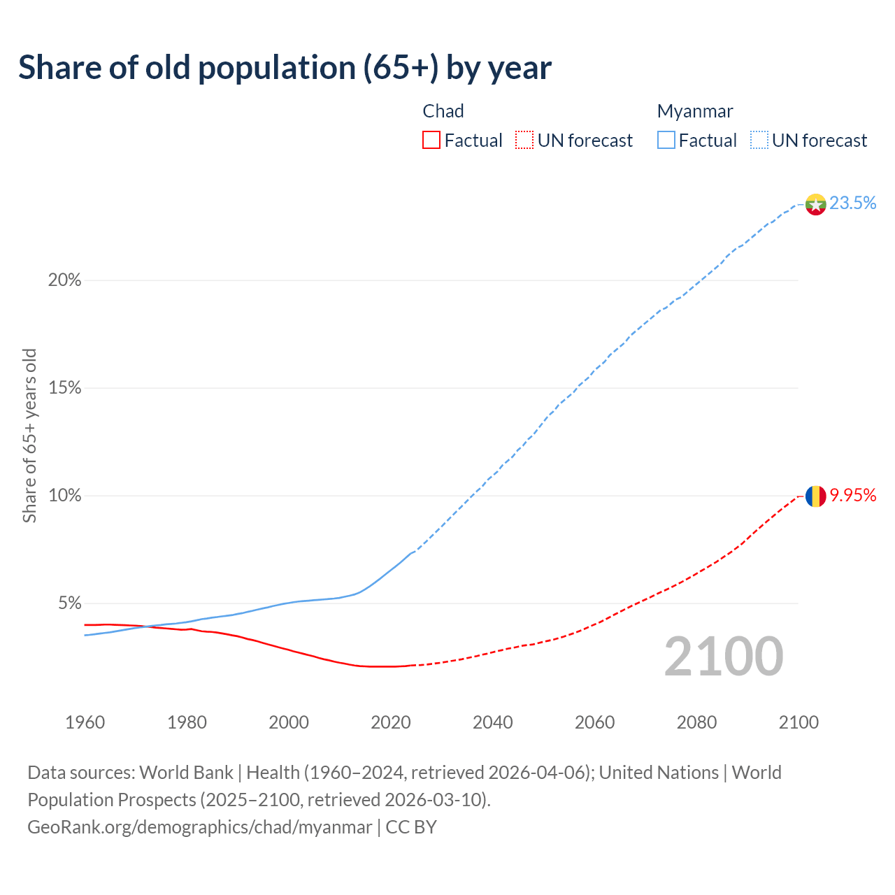 The share of older people aged 65 and over is 2.1% in Chad and 7.3% in Myanmar. Life expectancy in Chad compared to Myanmar .