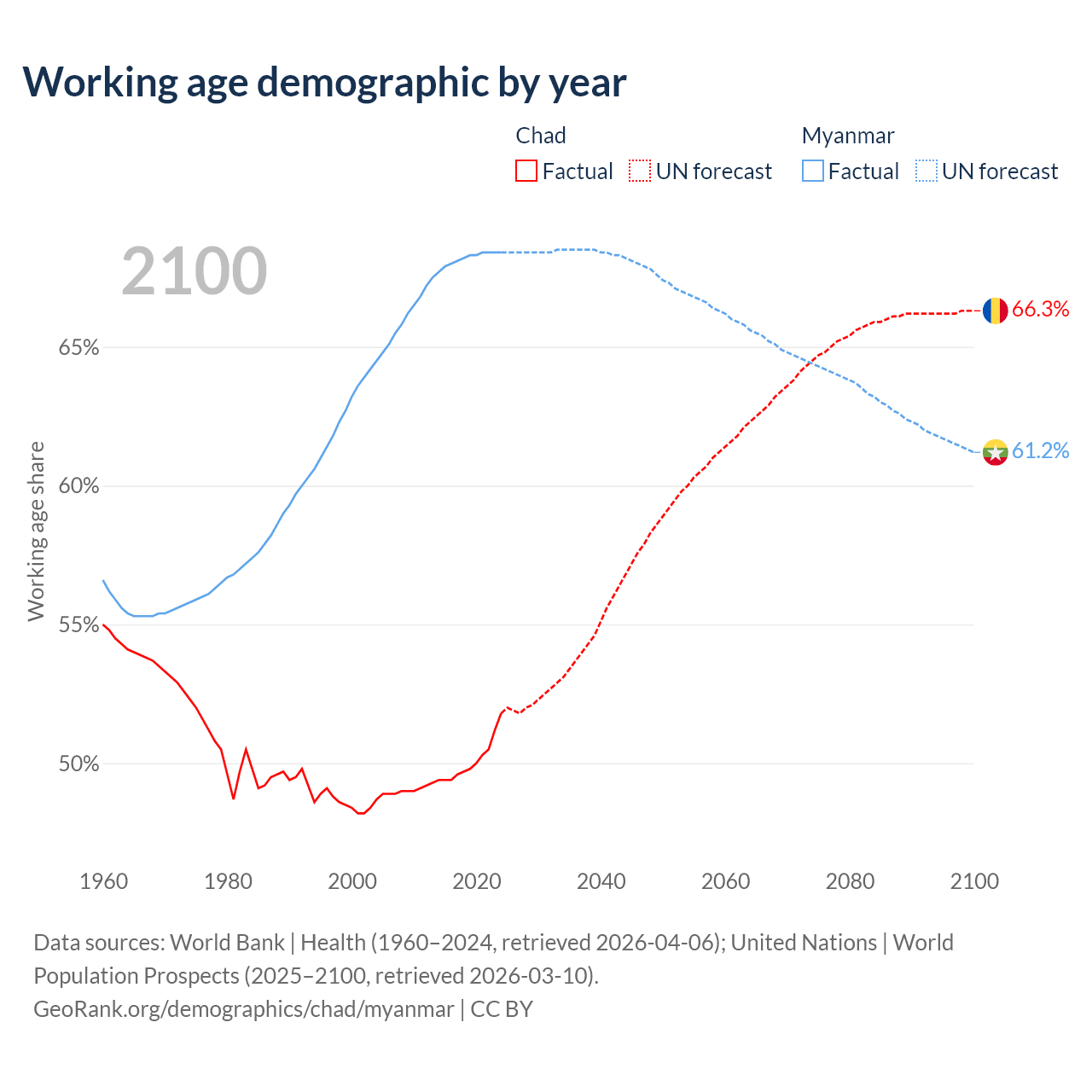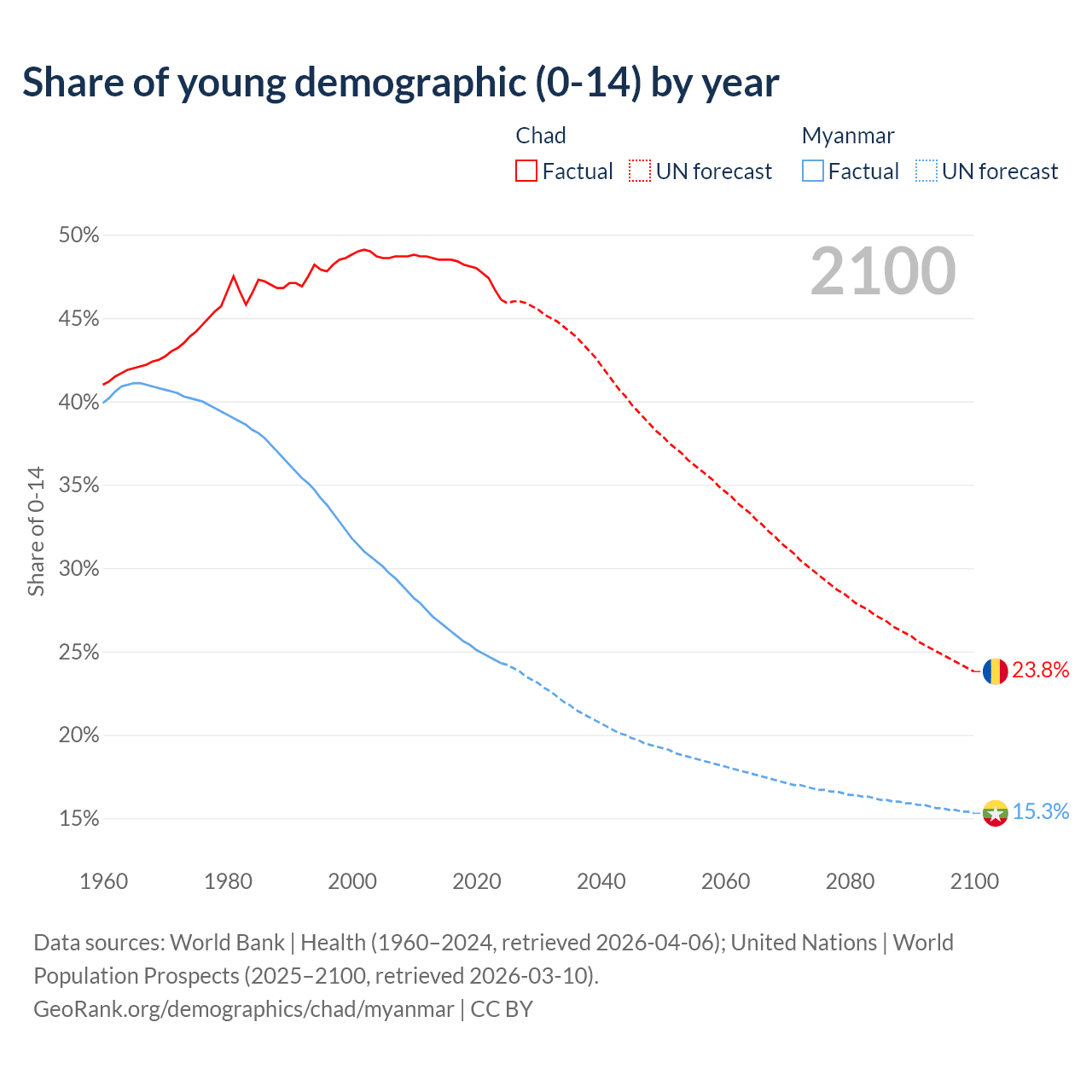 - The share of young demographic (0-15 years old) in Chad is 46.1% vs 24.3% in Myanmar.
