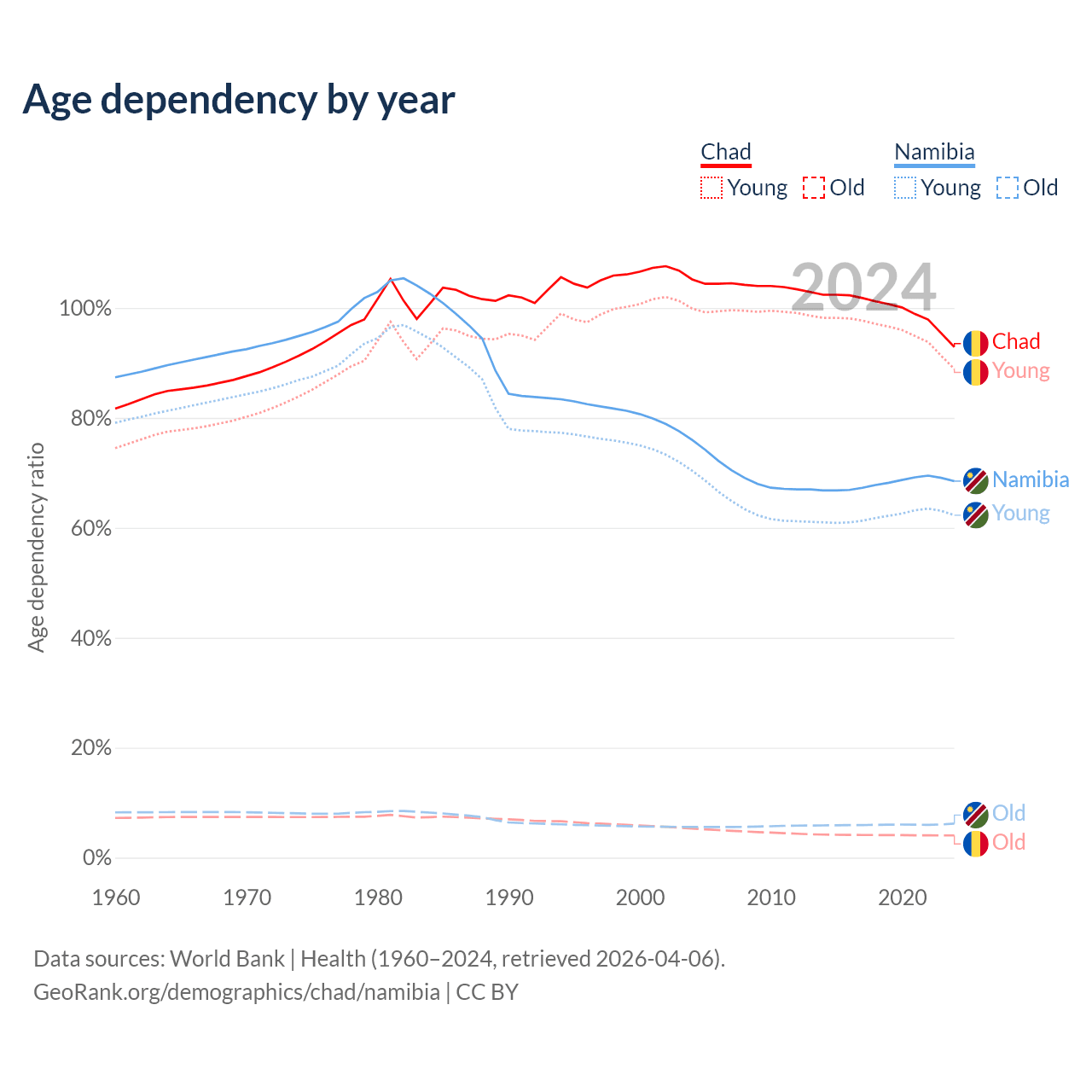 - Chad is ranked 192/196 by median age (oldest to youngest) vs 147/196 for Namibia.