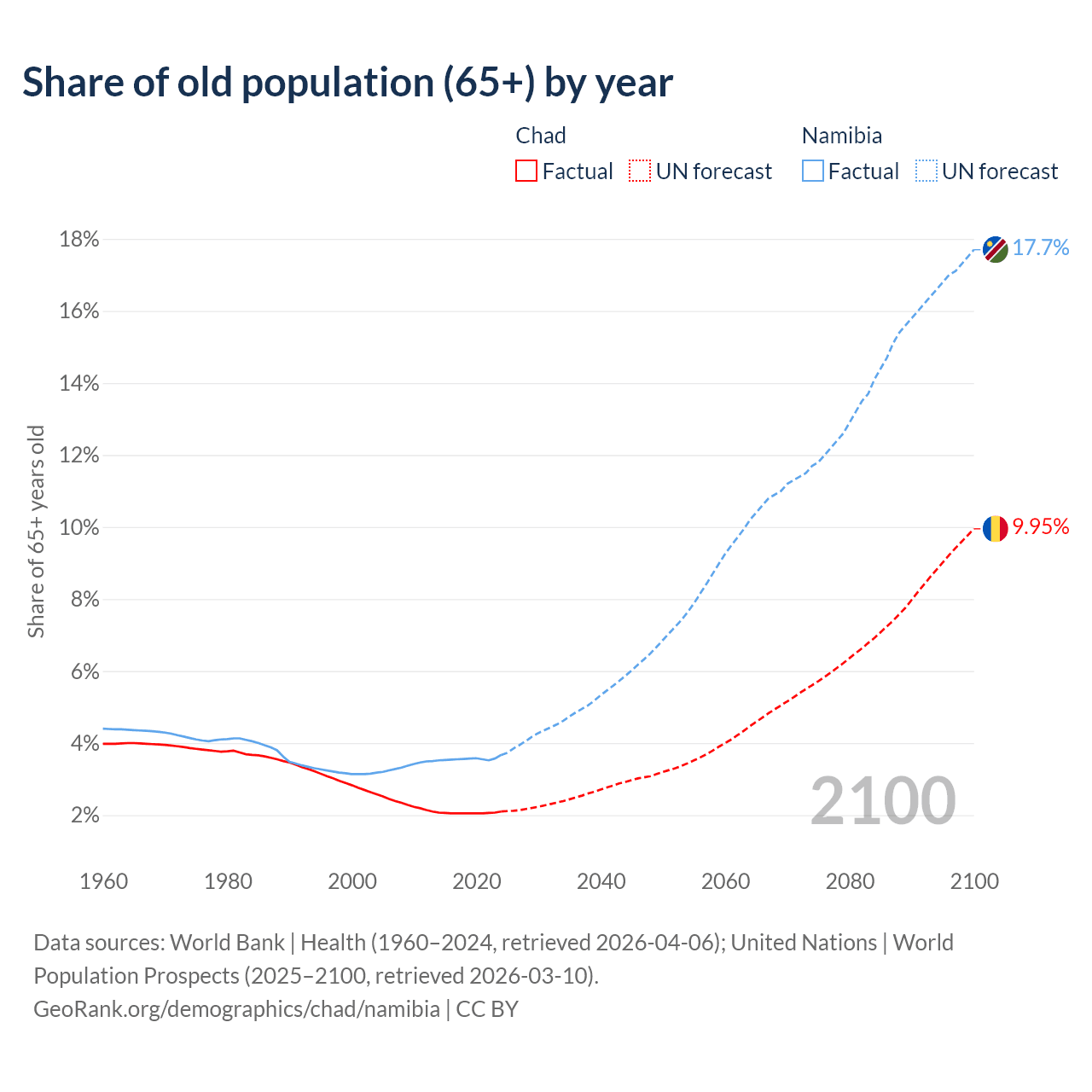 The share of older people aged 65 and over is 2.1% in Chad and 3.67% in Namibia. Life expectancy in Chad compared to Namibia .
