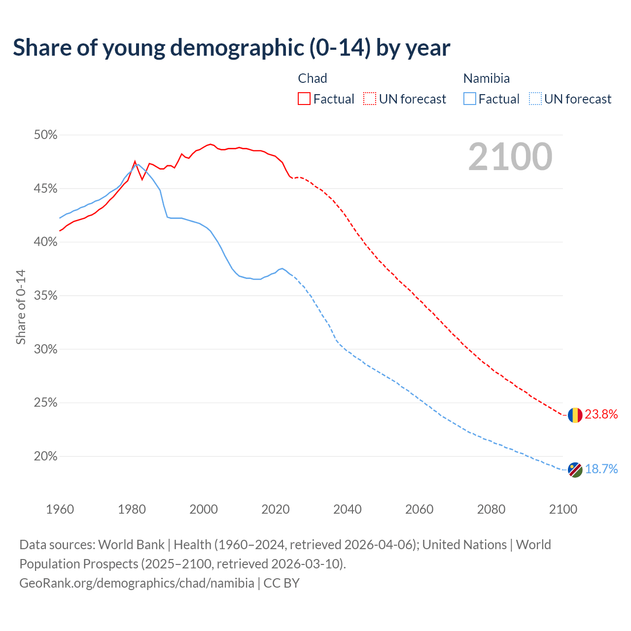 - The share of young demographic (0-15 years old) in Chad is 46.1% vs 37% in Namibia.