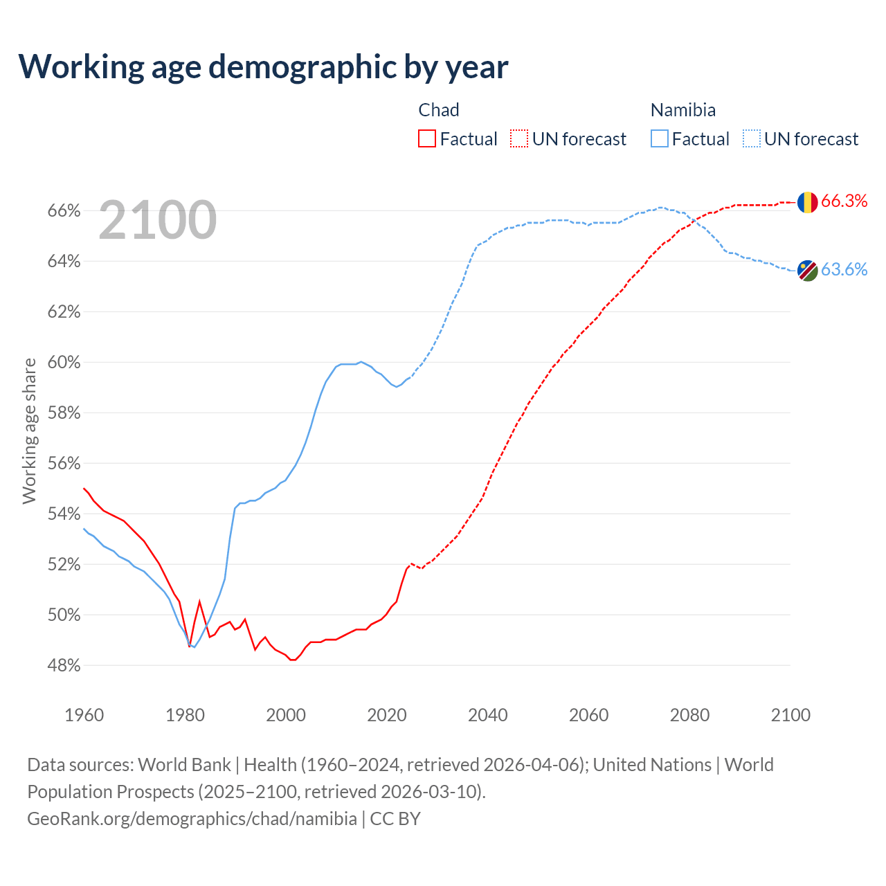 - Chad has 11.3M working age adults (aged 15-64) vs 1.88M in Namibia.