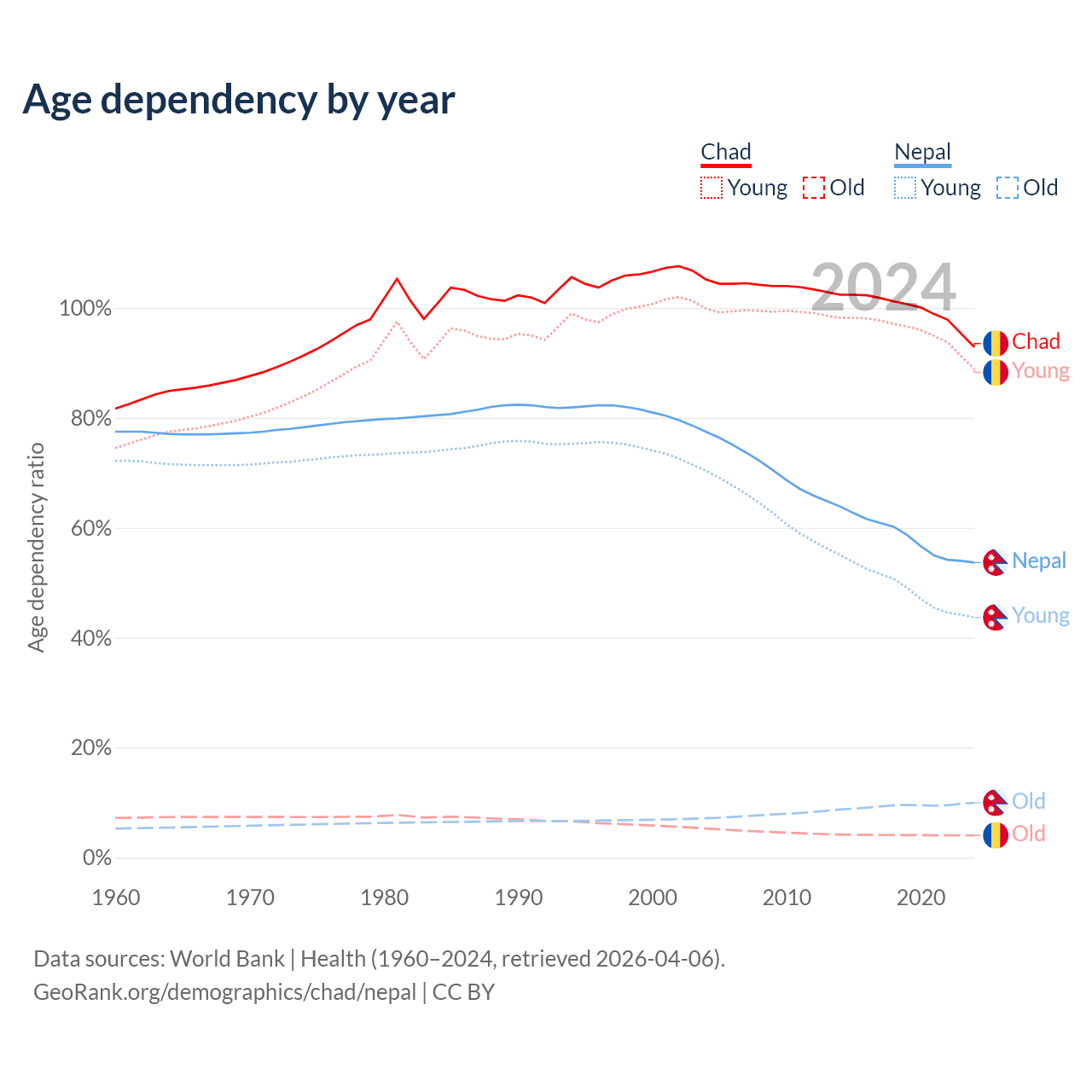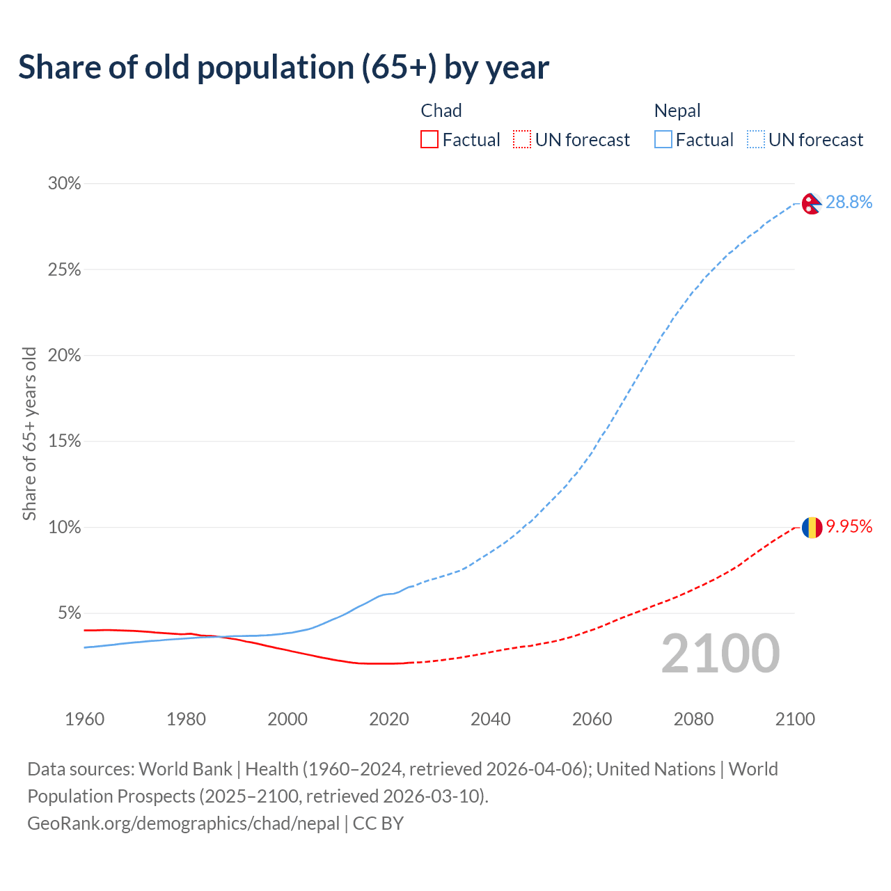 - The share of old-age demographic (65+) in Chad is 2.1% vs 6.5% in Nepal.