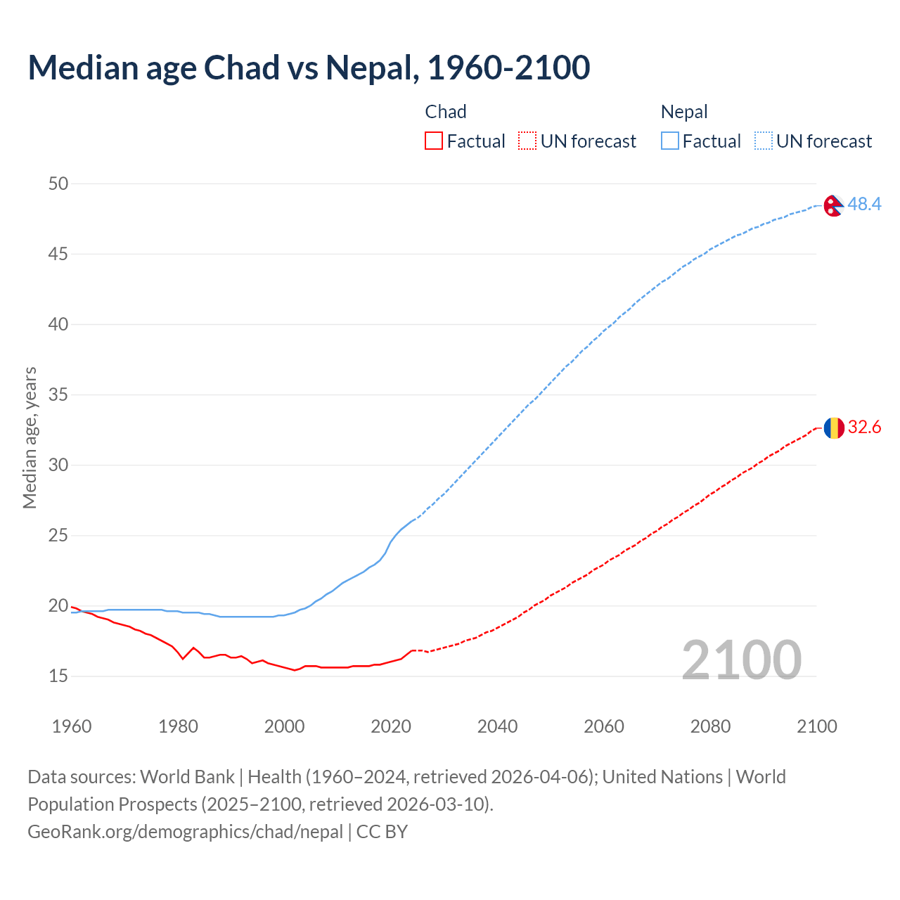 - The median age in Chad is 16.8 years compared to 26 years in Nepal.
