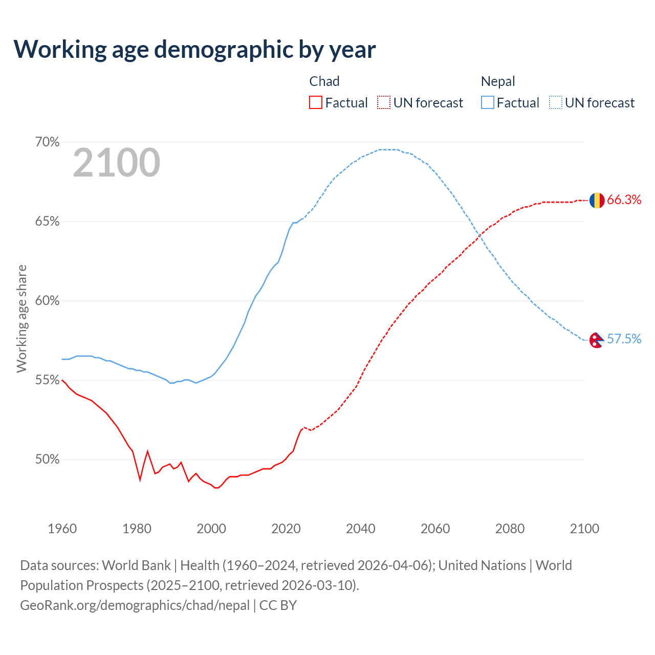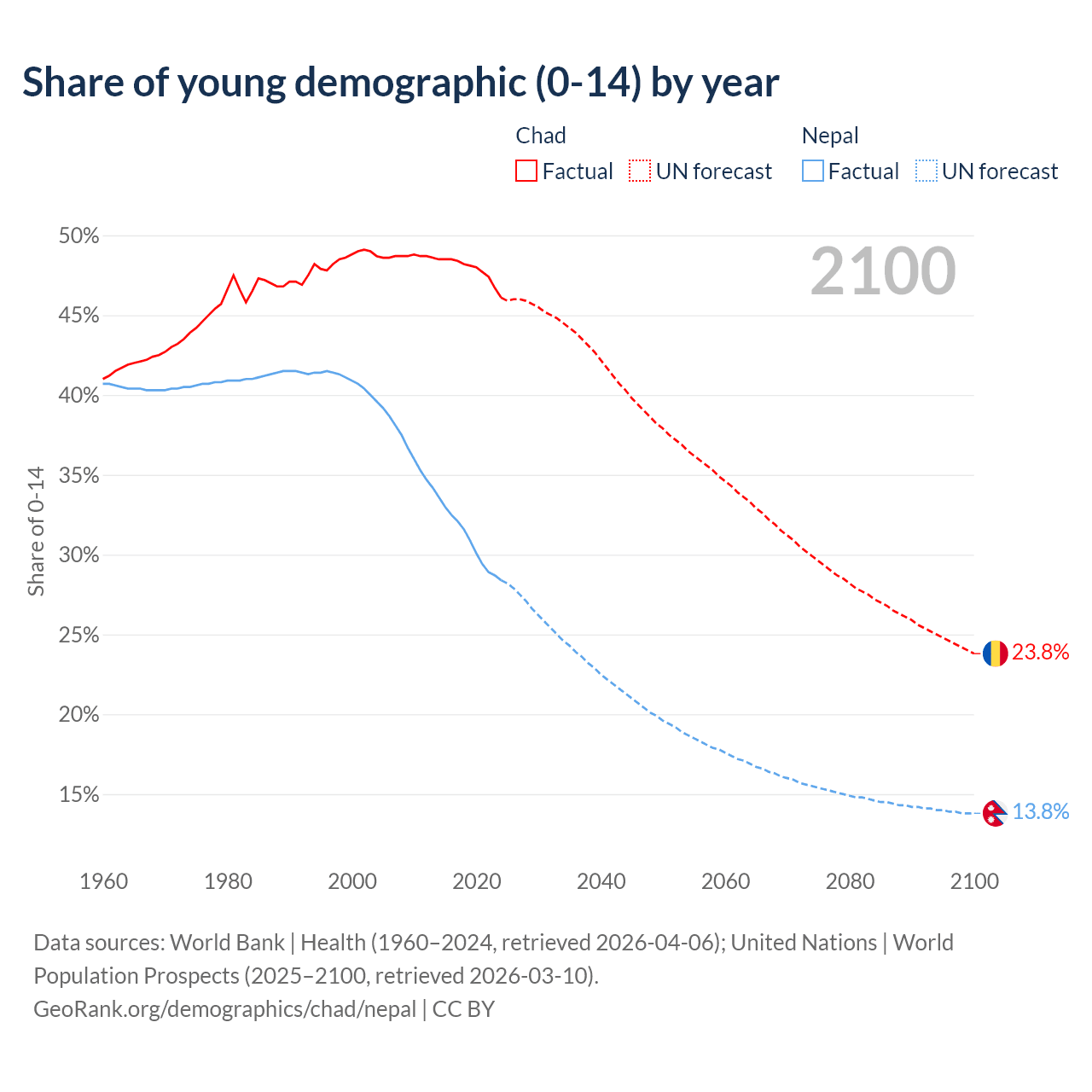 - The share of young demographic (0-15 years old) in Chad is 46.1% vs 28.4% in Nepal.