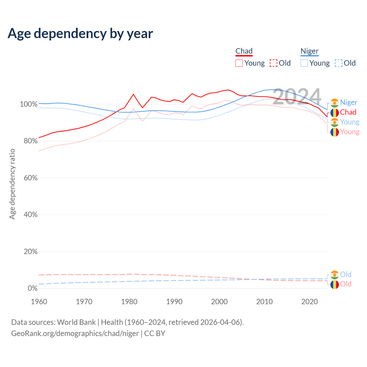 - Chad is ranked 192/196 by median age (oldest to youngest) vs 195/196 for Niger.
