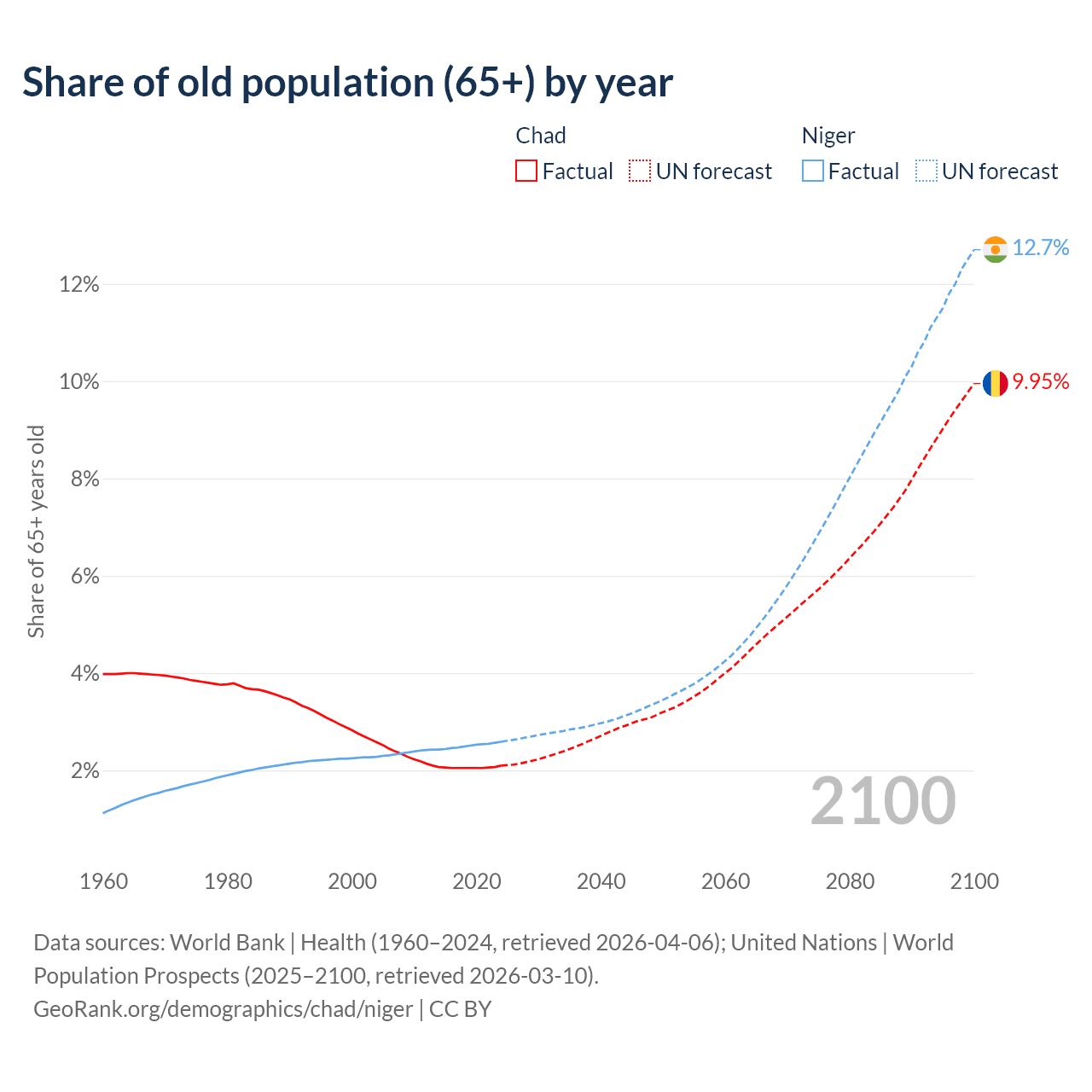 - The share of old-age demographic (65+) in Chad is 2.1% vs 2.59% in Niger.