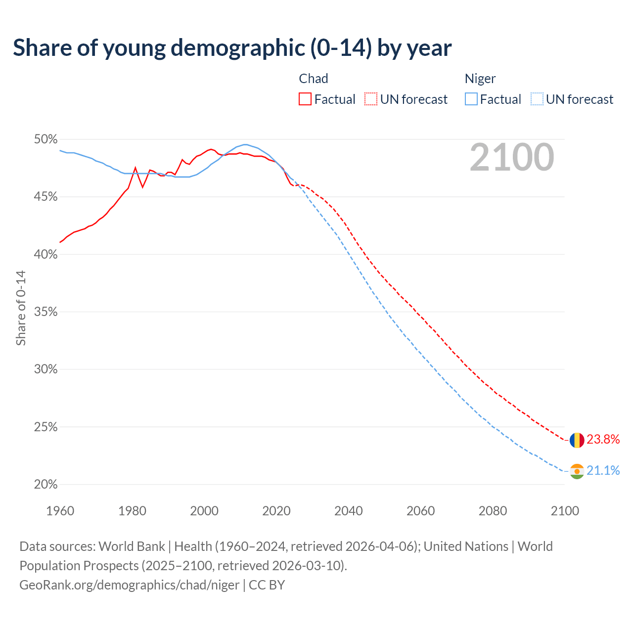 - The share of young demographic (0-15 years old) in Chad is 46.1% vs 46.6% in Niger.