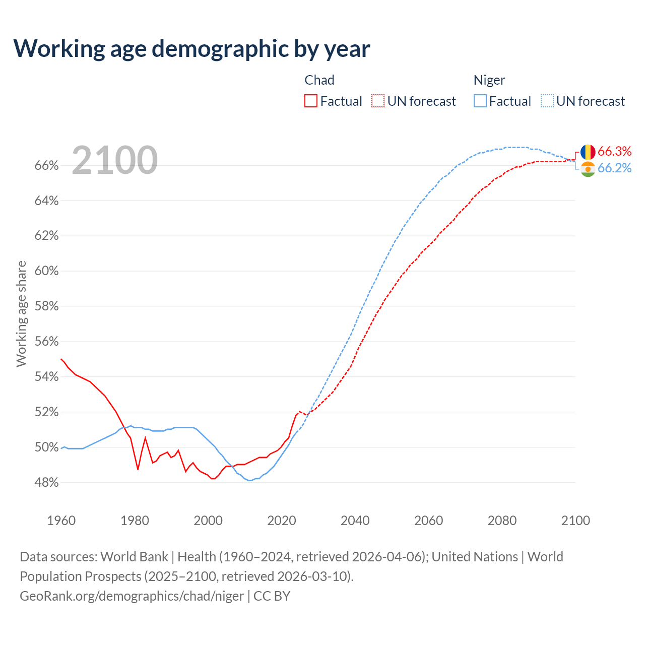 The share of older people aged 65 and over is 2.1% in Chad and 2.59% in Niger. Life expectancy in Chad compared to Niger .
