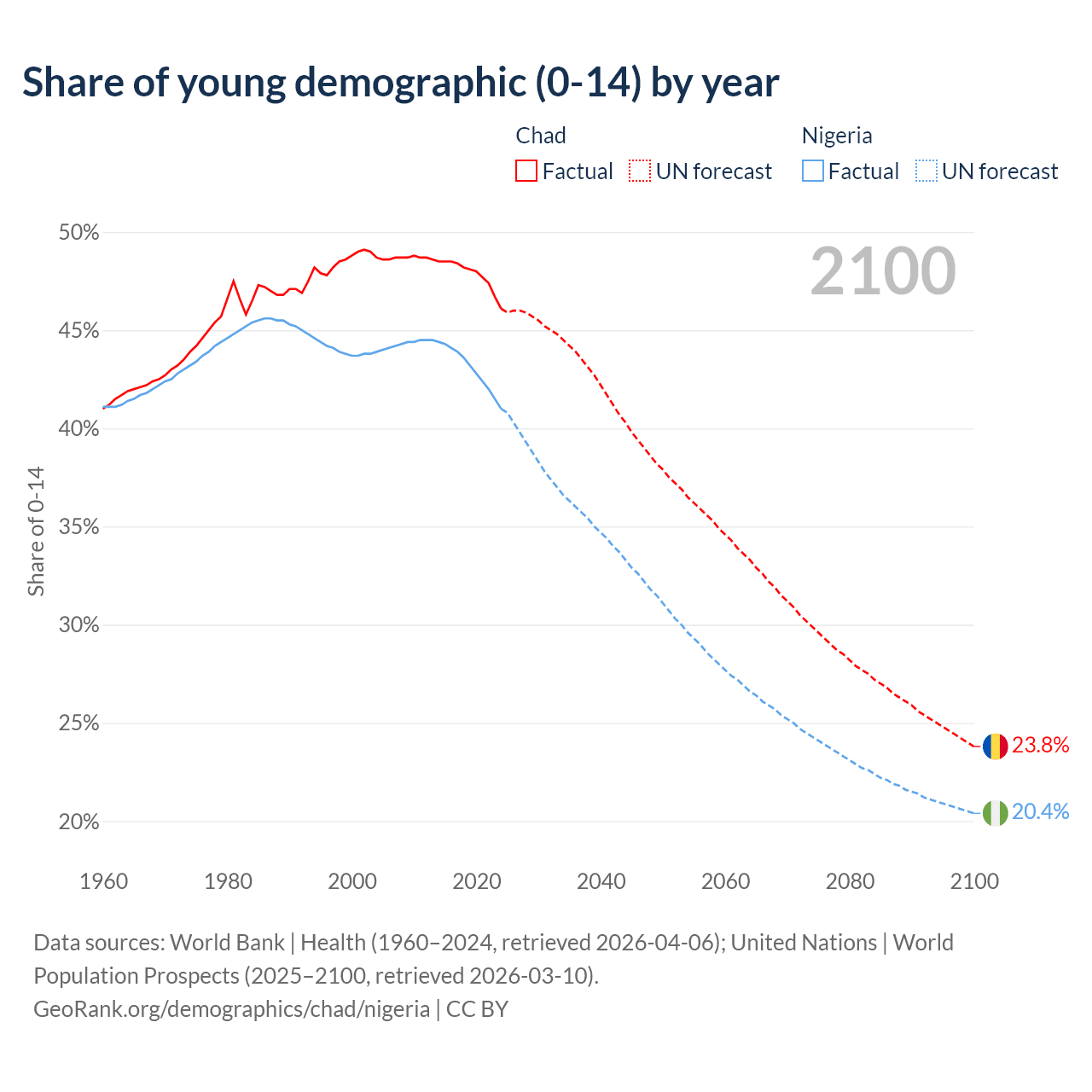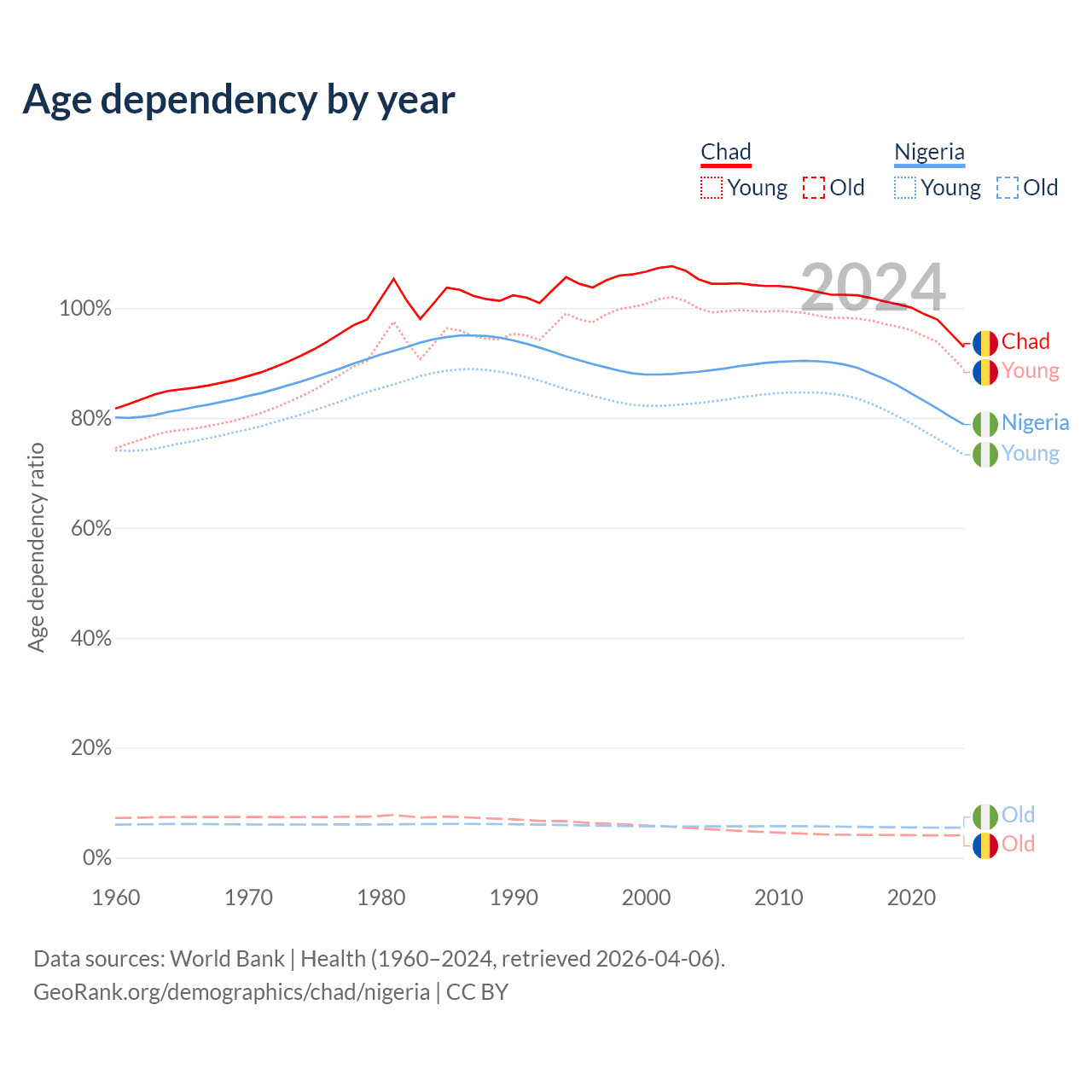 - Chad is ranked 192/196 by median age (oldest to youngest) vs 178/196 for Nigeria.