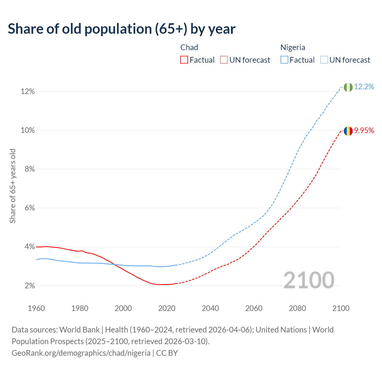 The share of older people aged 65 and over is 2.1% in Chad and 3.05% in Nigeria. Life expectancy in Chad compared to Nigeria .