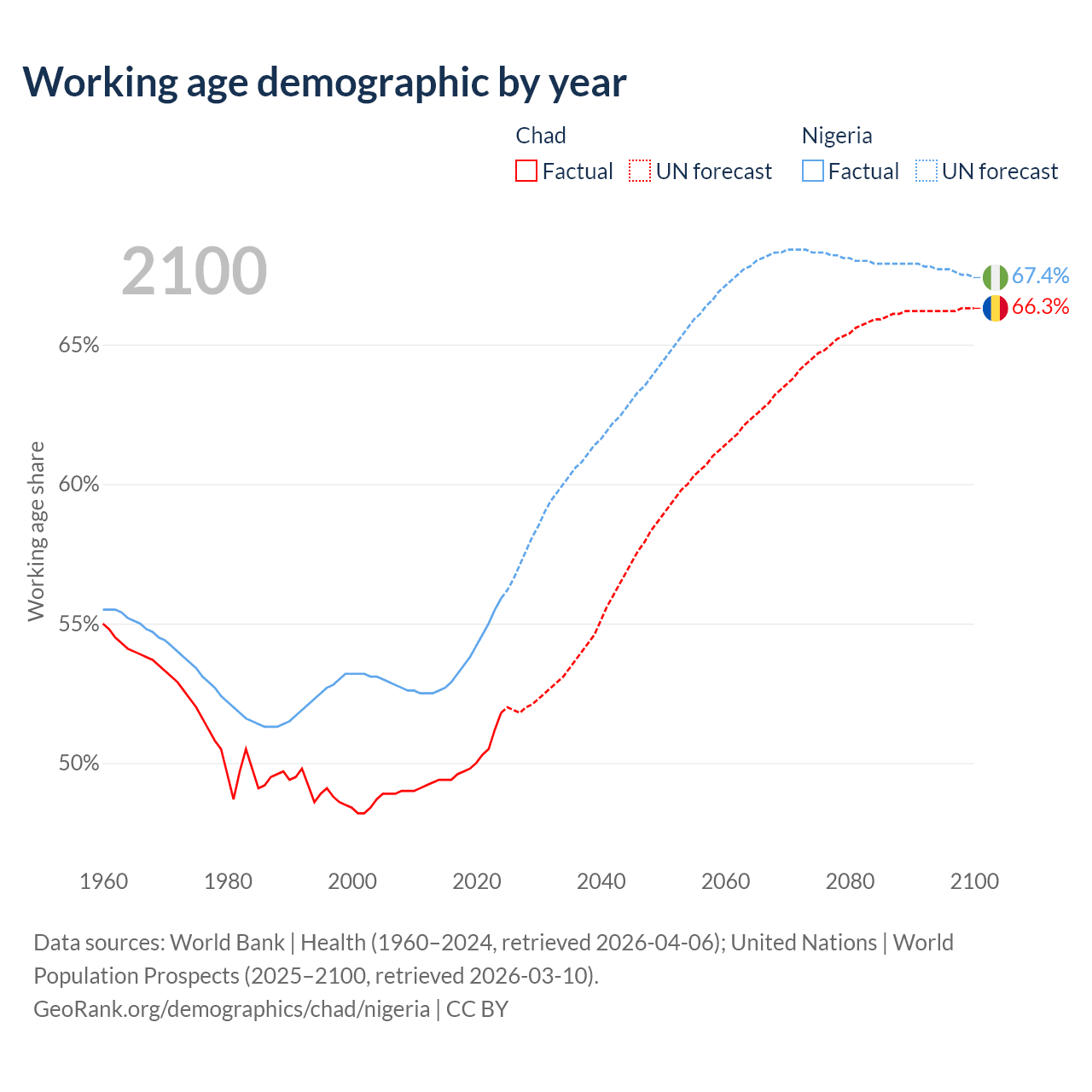 - Chad has 11.3M working age adults (aged 15-64) vs 136M in Nigeria.