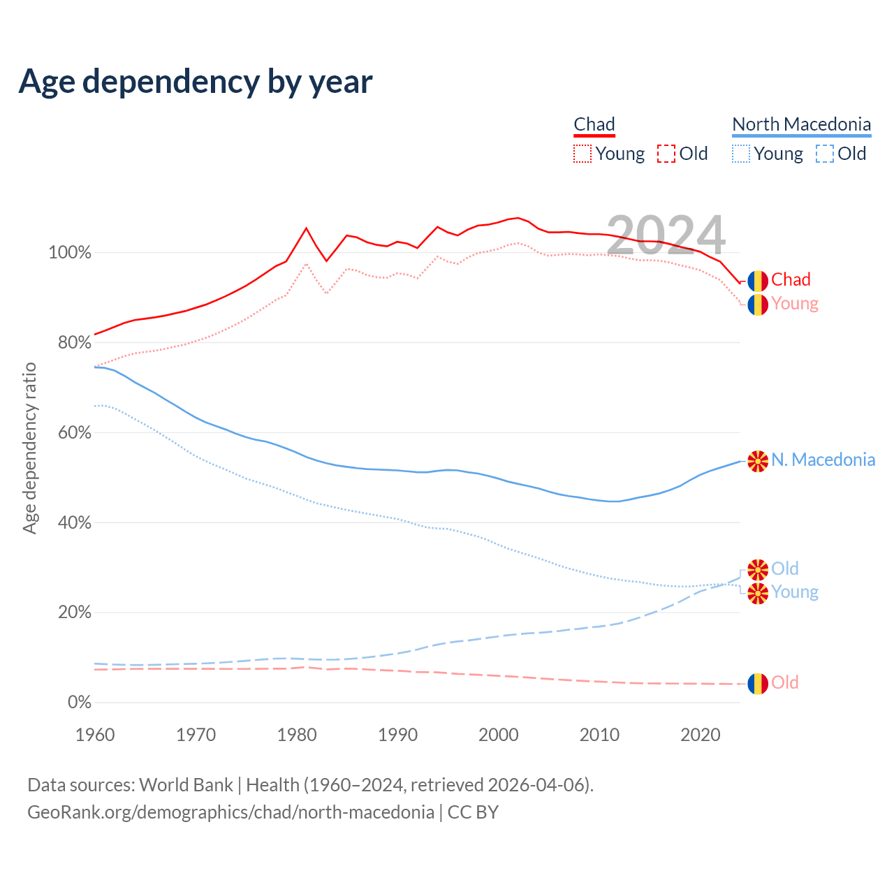 - The share of old-age demographic (65+) in Chad is 2.1% vs 18% in North Macedonia.