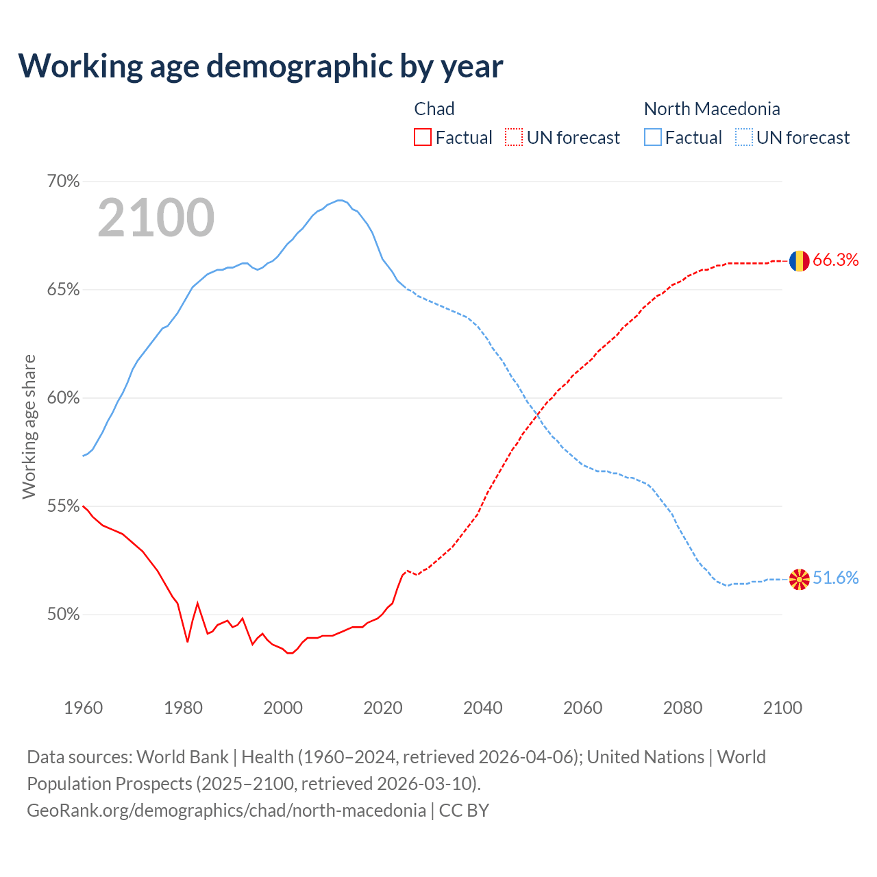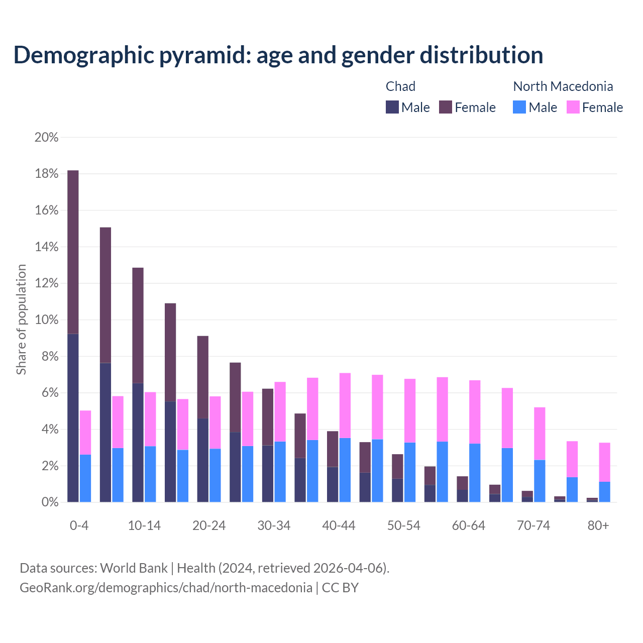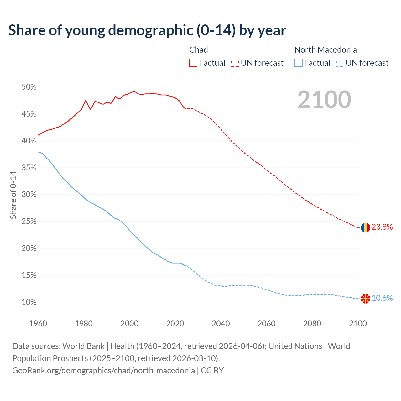 - The share of young demographic (0-15 years old) in Chad is 46.1% vs 16.8% in North Macedonia.