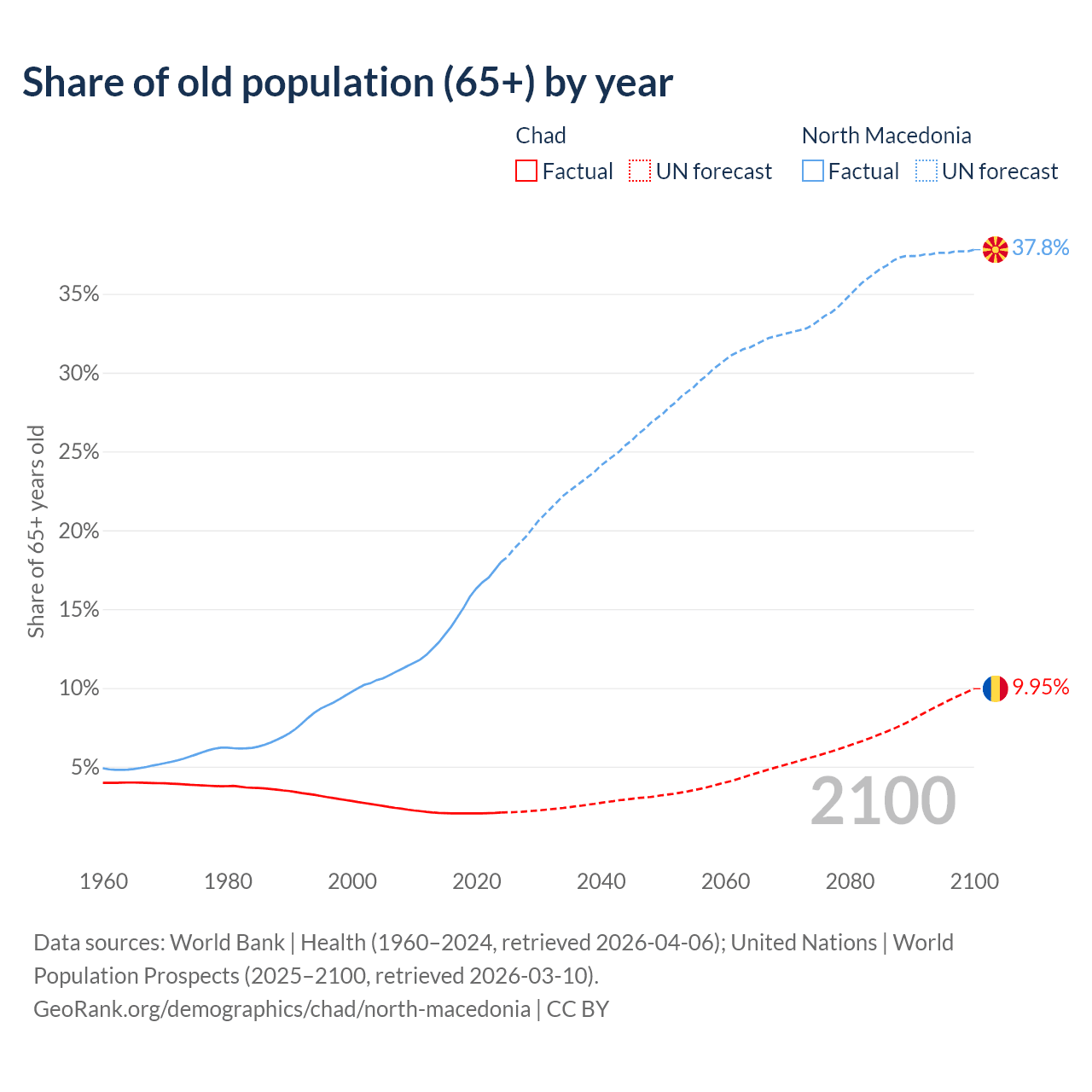 The share of older people aged 65 and over is 2.1% in Chad and 18% in North Macedonia. Life expectancy in Chad compared to North Macedonia .