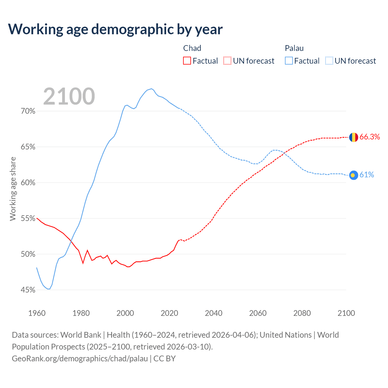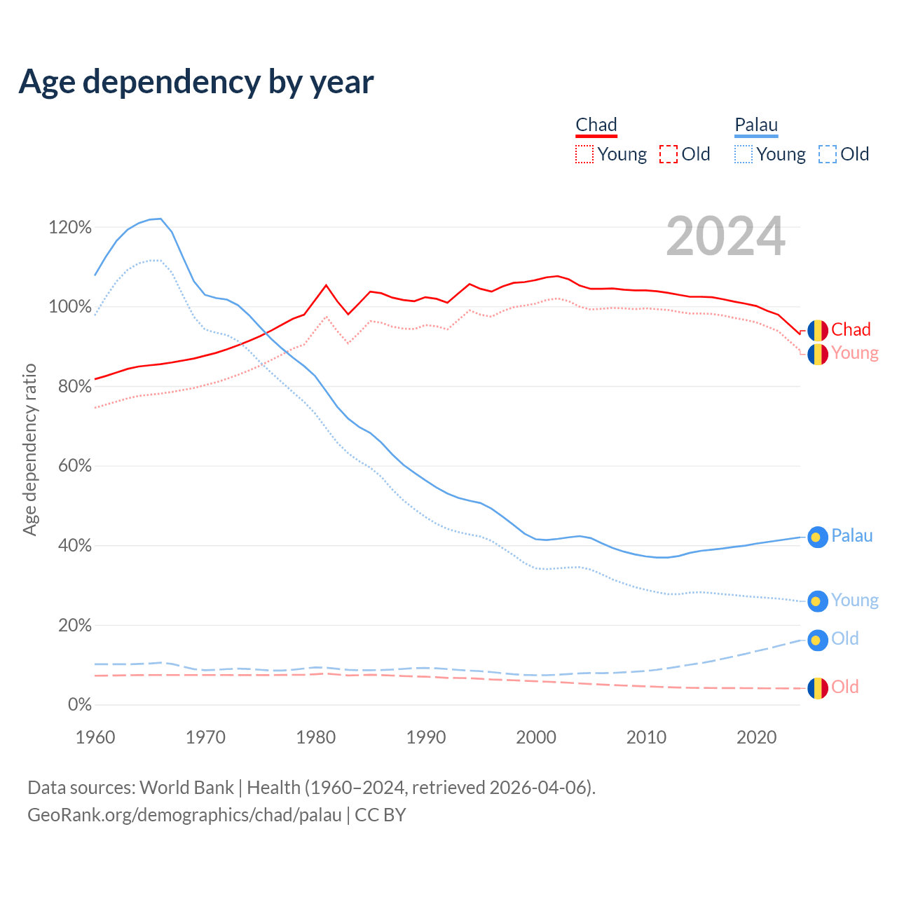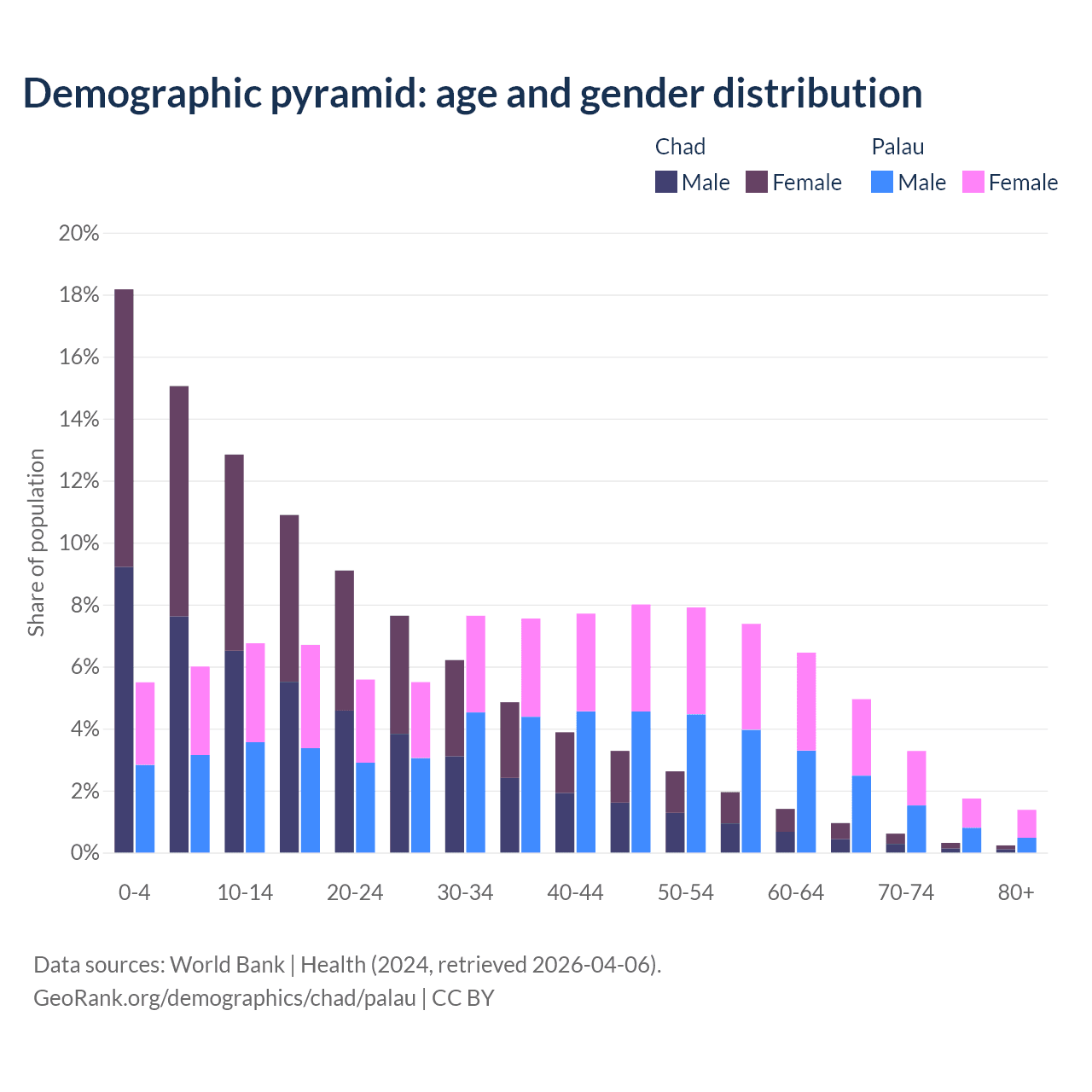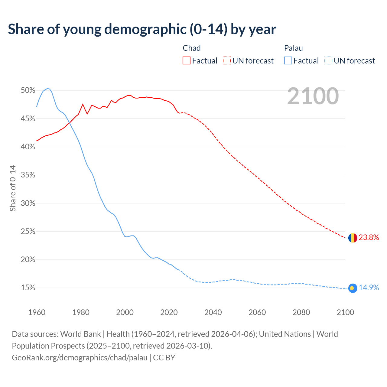 - The share of young demographic (0-15 years old) in Chad is 46.1% vs 18.2% in Palau.