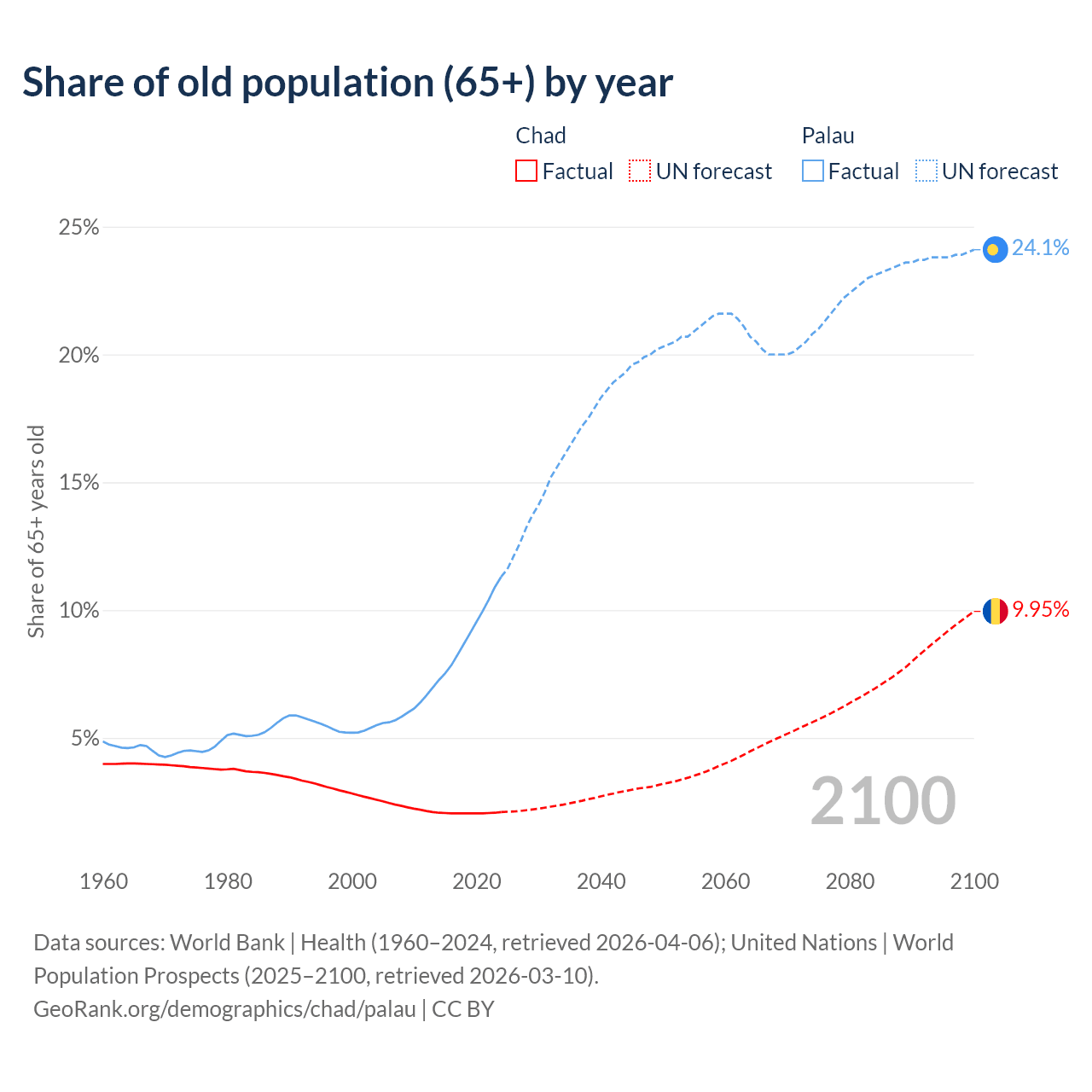 - The share of old-age demographic (65+) in Chad is 2.1% vs 11.3% in Palau.