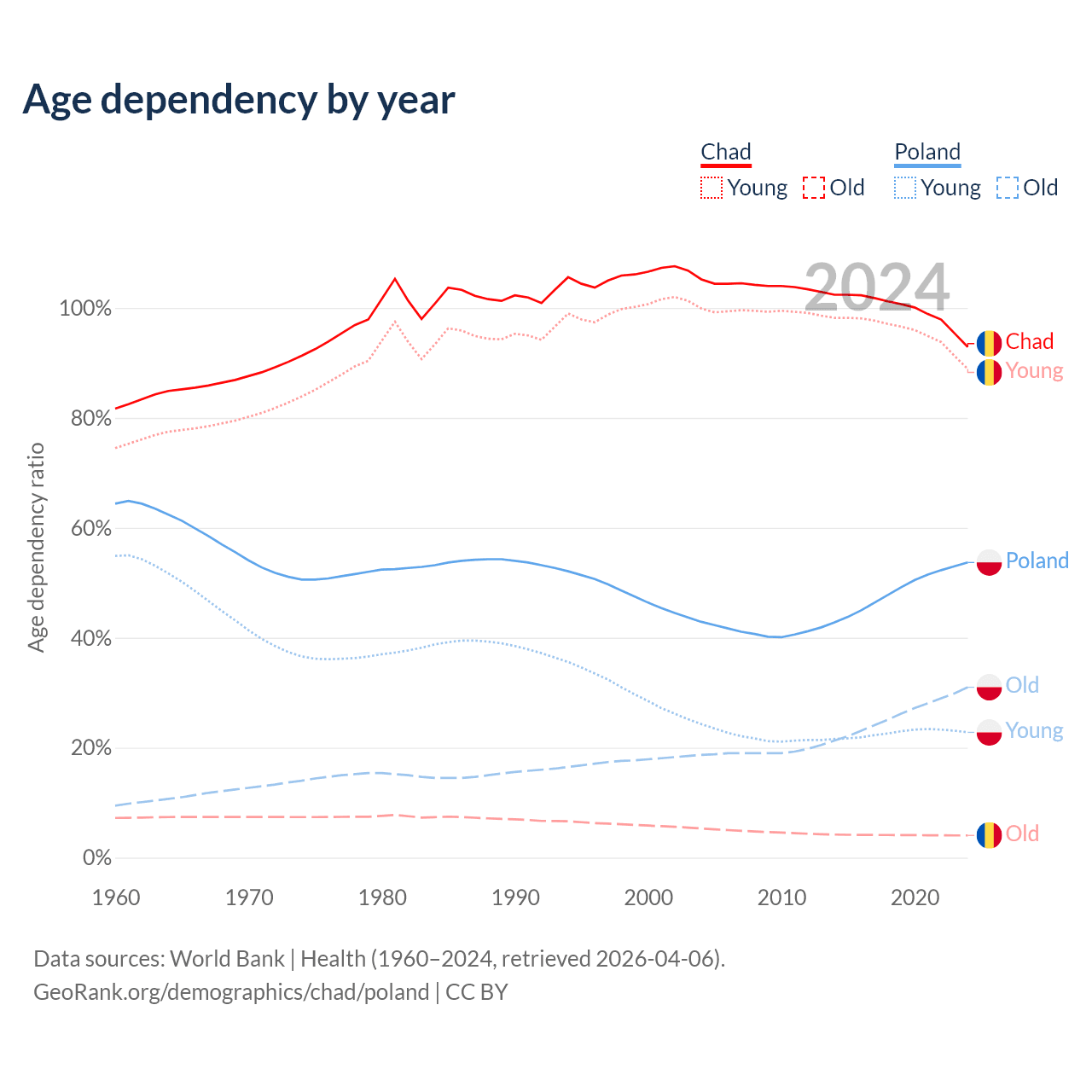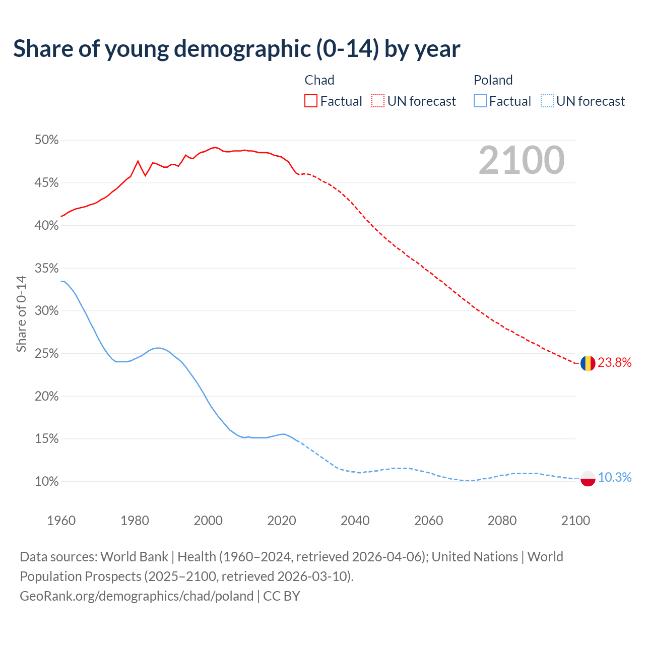 - The share of young demographic (0-15 years old) in Chad is 46.1% vs 14.8% in Poland.