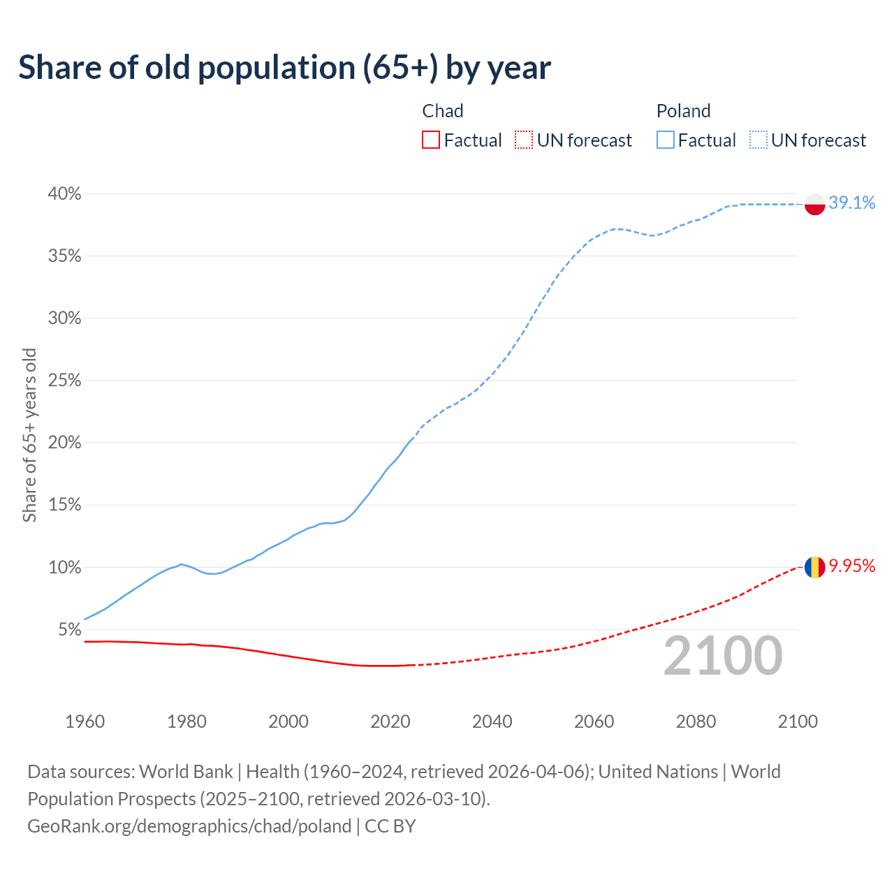 - The share of old-age demographic (65+) in Chad is 2.1% vs 20.1% in Poland.