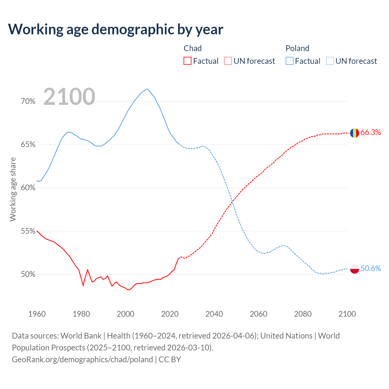 - Chad has 11.3M working age adults (aged 15-64) vs 23.3M in Poland.