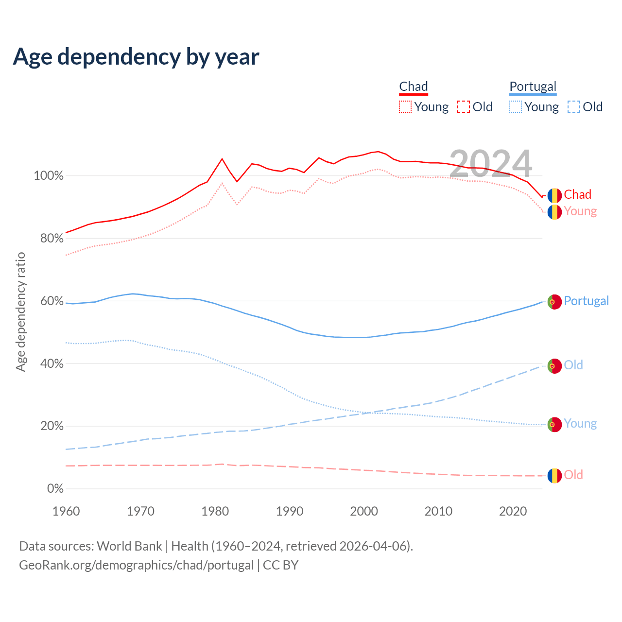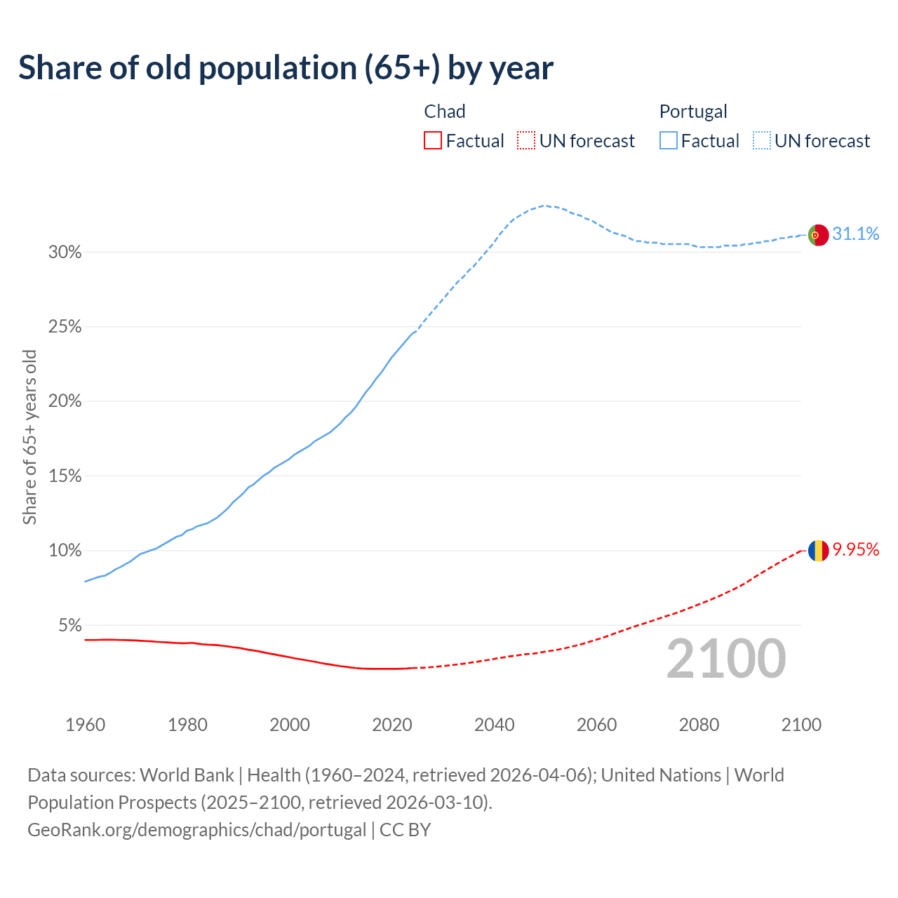 - The share of old-age demographic (65+) in Chad is 2.1% vs 24.5% in Portugal.