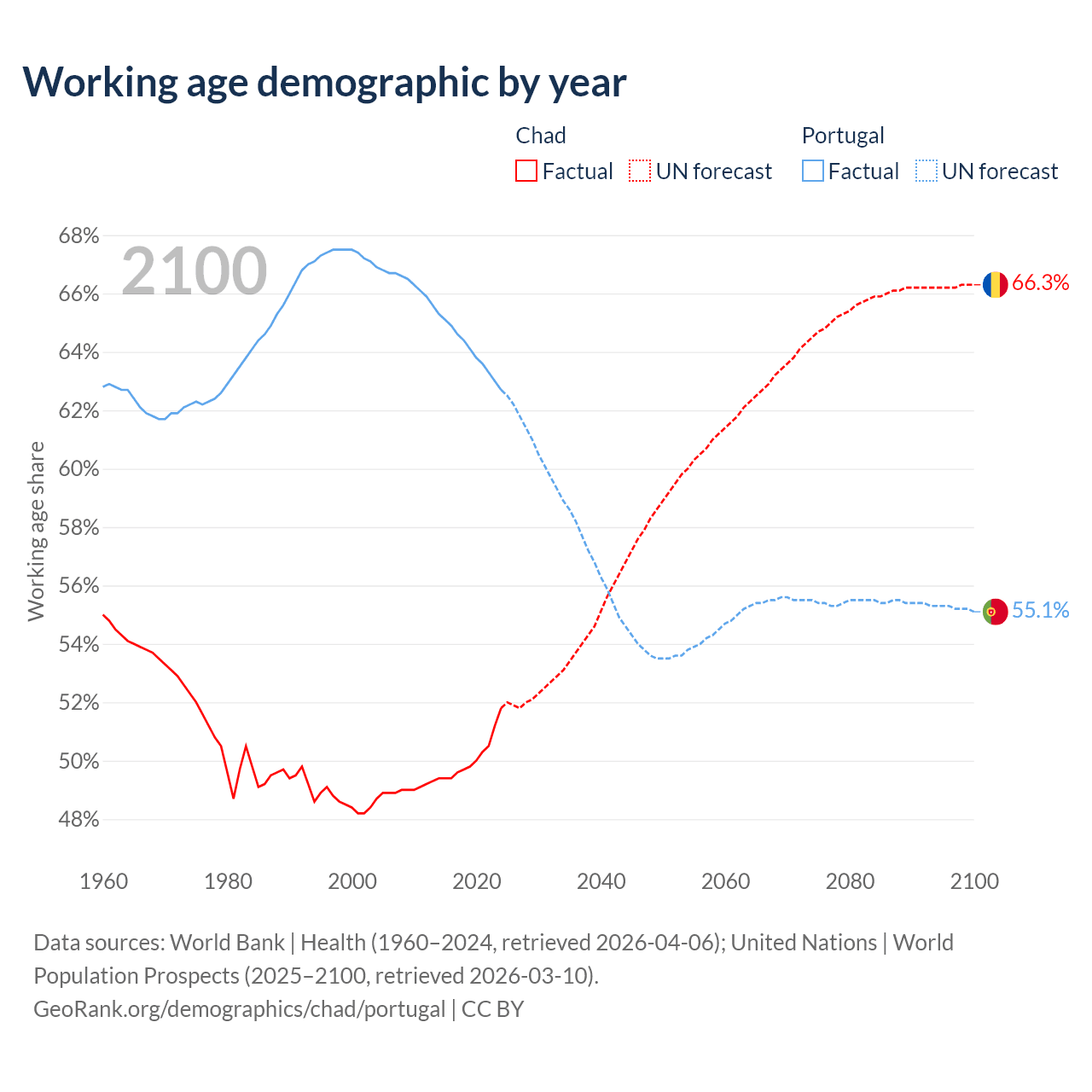 - The share of young demographic (0-15 years old) in Chad is 46.1% vs 12.8% in Portugal.