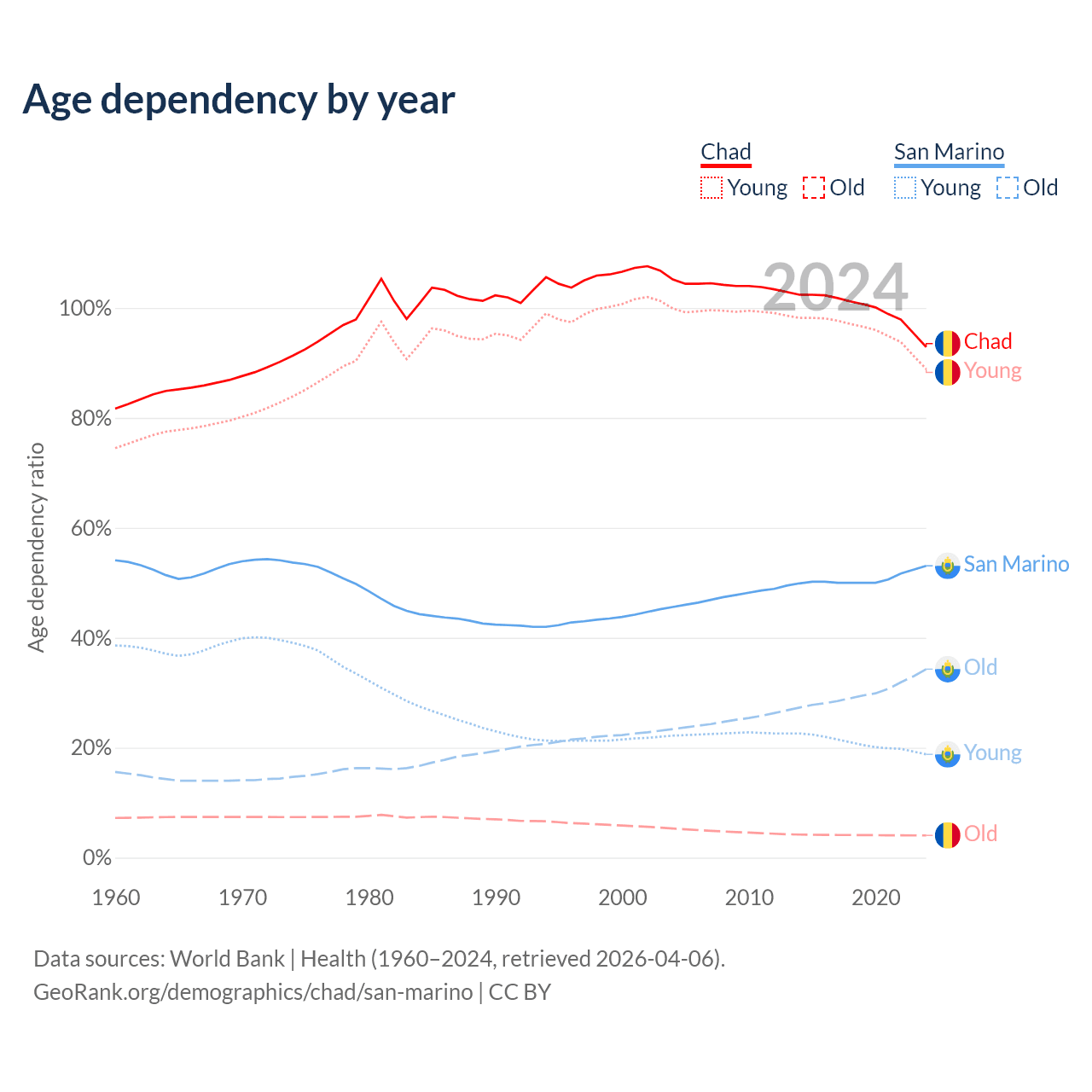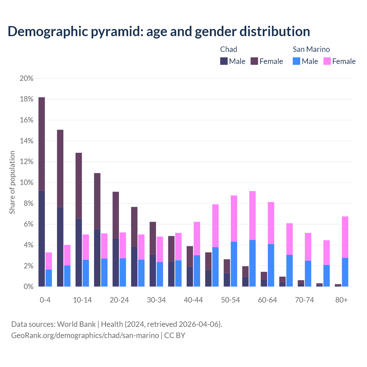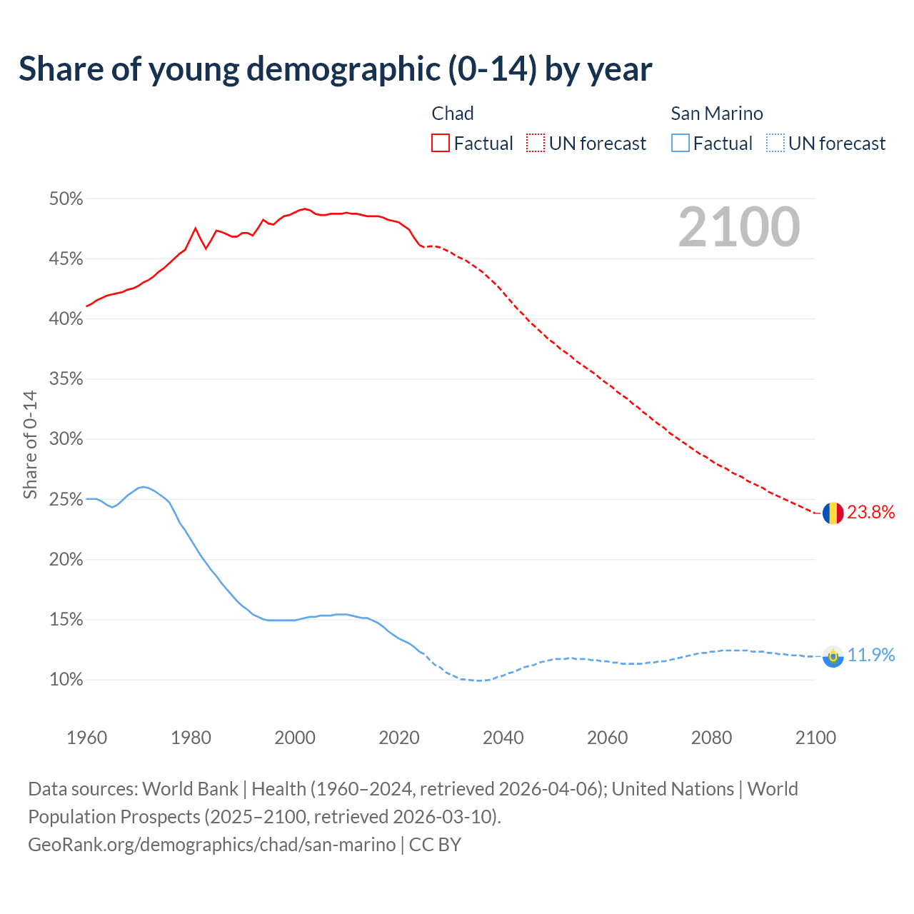 - The share of young demographic (0-15 years old) in Chad is 46.1% vs 12.3% in San Marino.