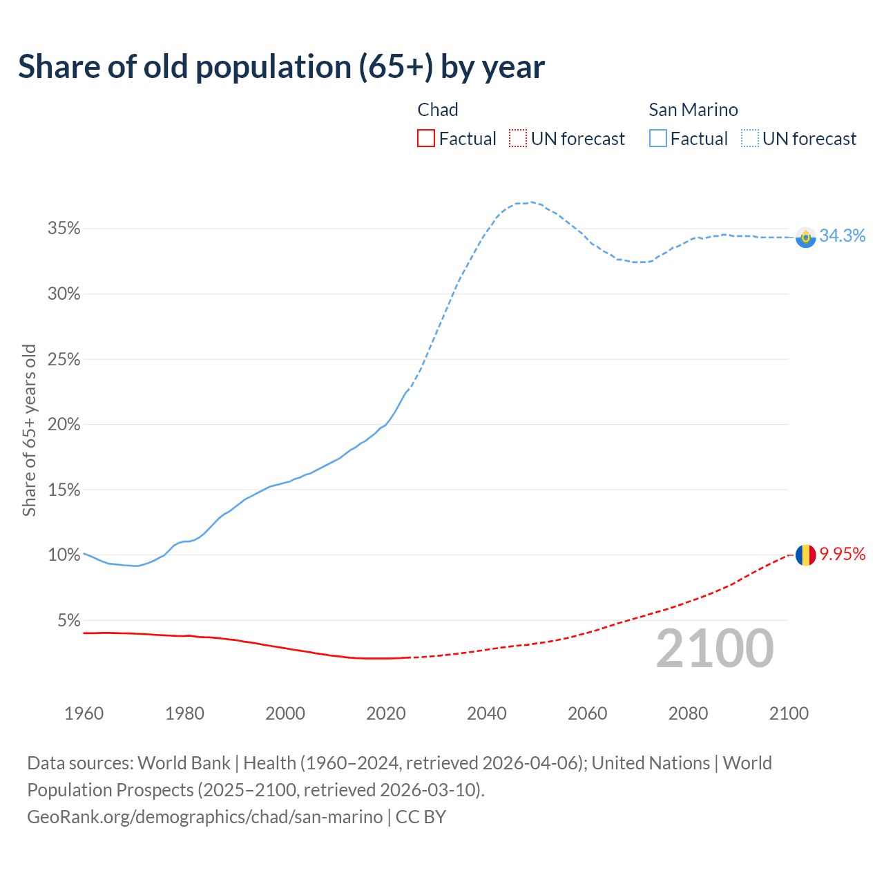 - The share of old-age demographic (65+) in Chad is 2.1% vs 22.4% in San Marino.