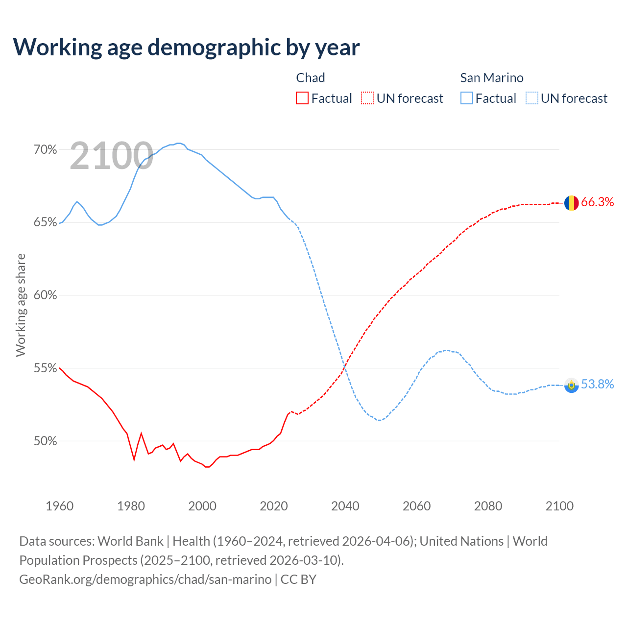 - Chad has 11.3M working age adults (aged 15-64) vs 22.2K in San Marino.