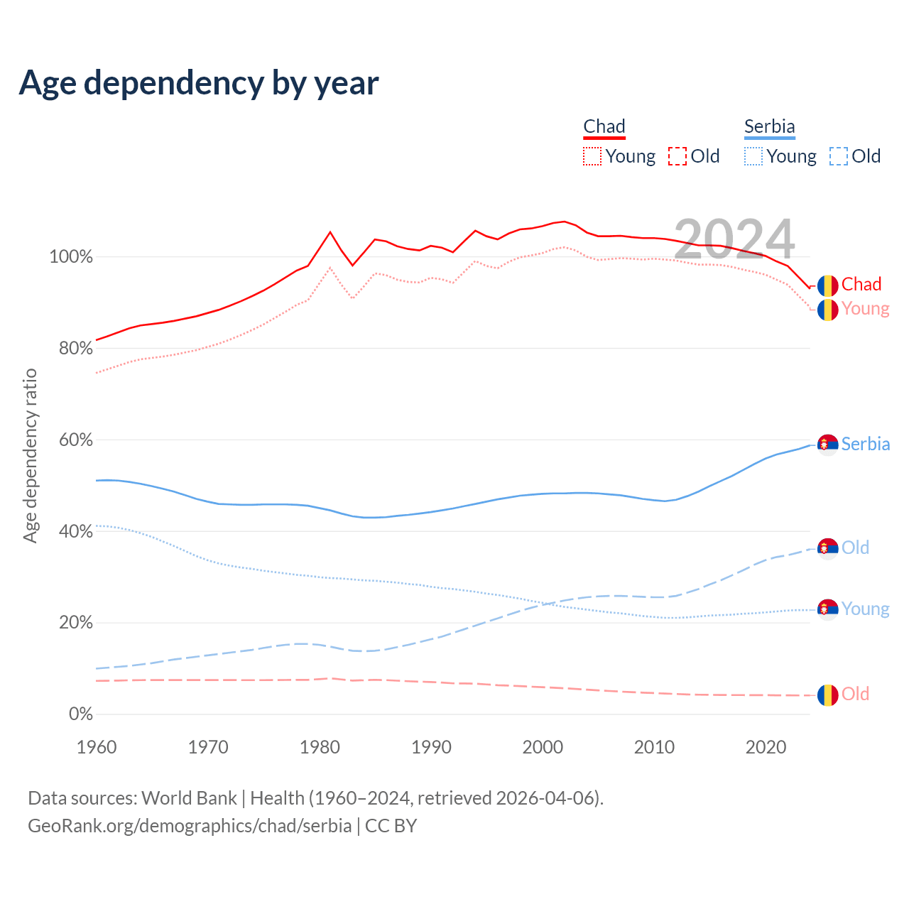 - The share of old-age demographic (65+) in Chad is 2.1% vs 22.7% in Serbia.