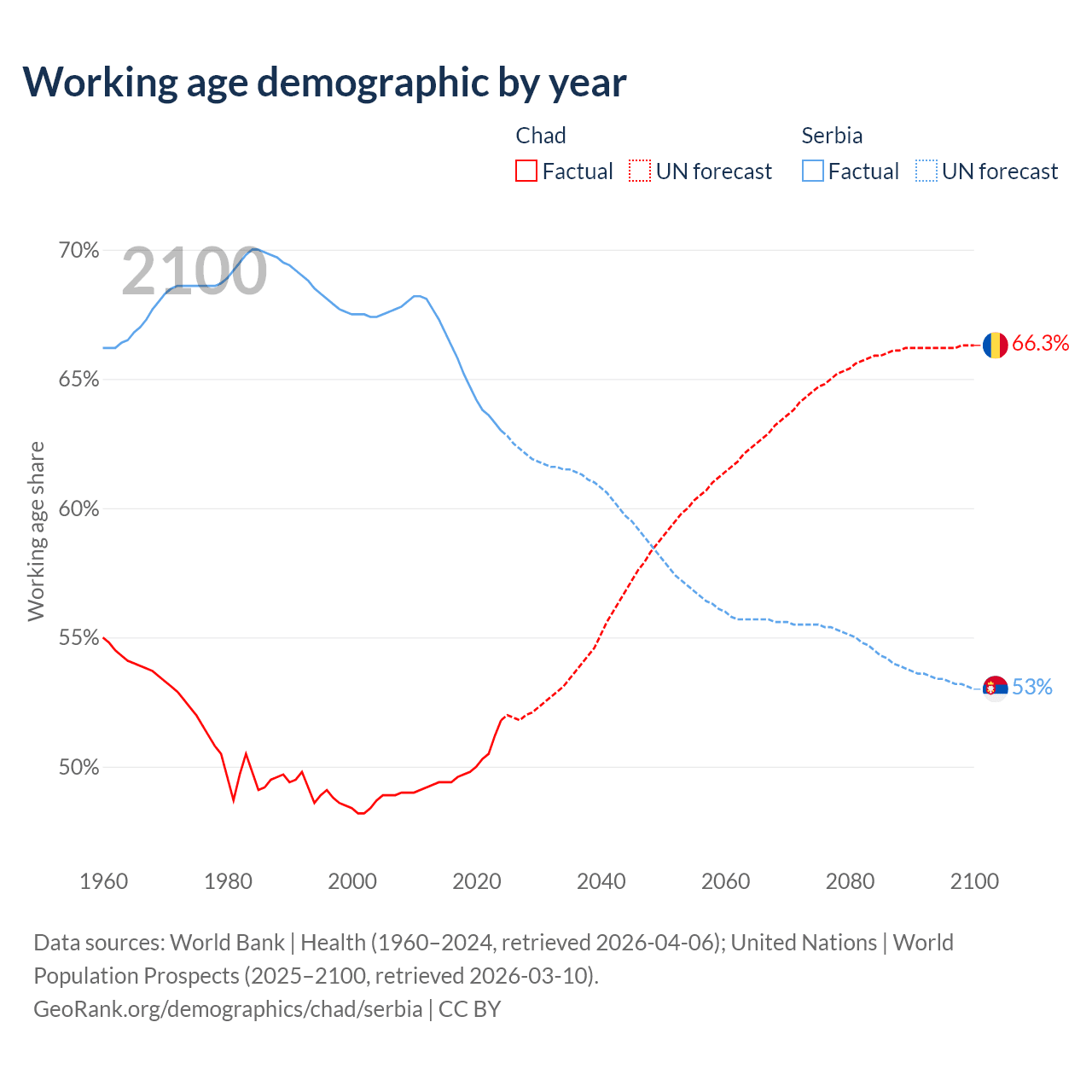 - Chad has 11.3M working age adults (aged 15-64) vs 4.09M in Serbia.