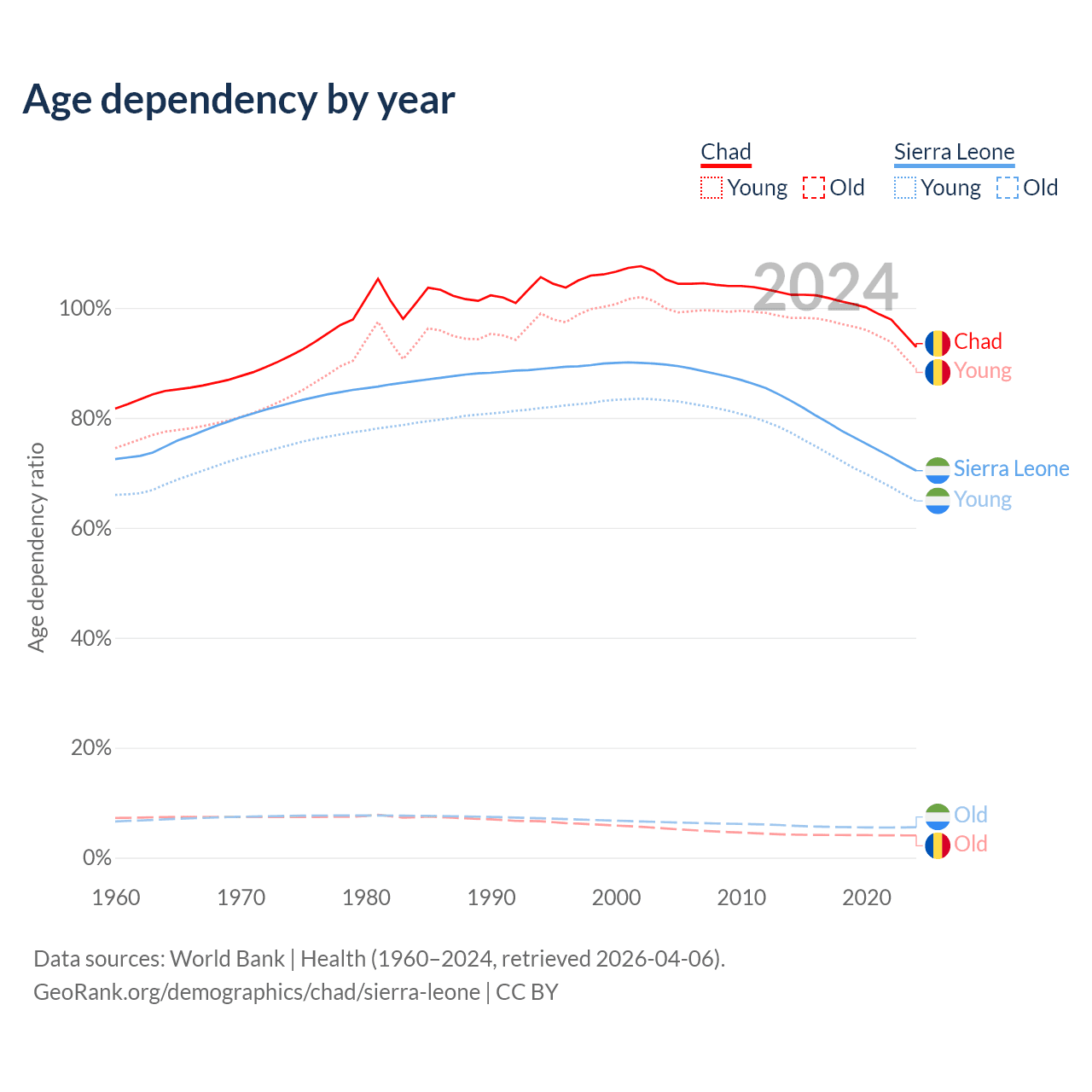 - Chad is ranked 192/196 by median age (oldest to youngest) vs 161/196 for Sierra Leone.