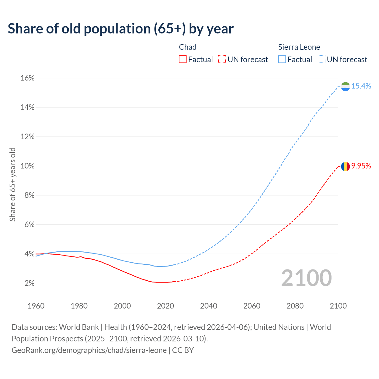 The share of older people aged 65 and over is 2.1% in Chad and 3.24% in Sierra Leone. Life expectancy in Chad compared to Sierra Leone .