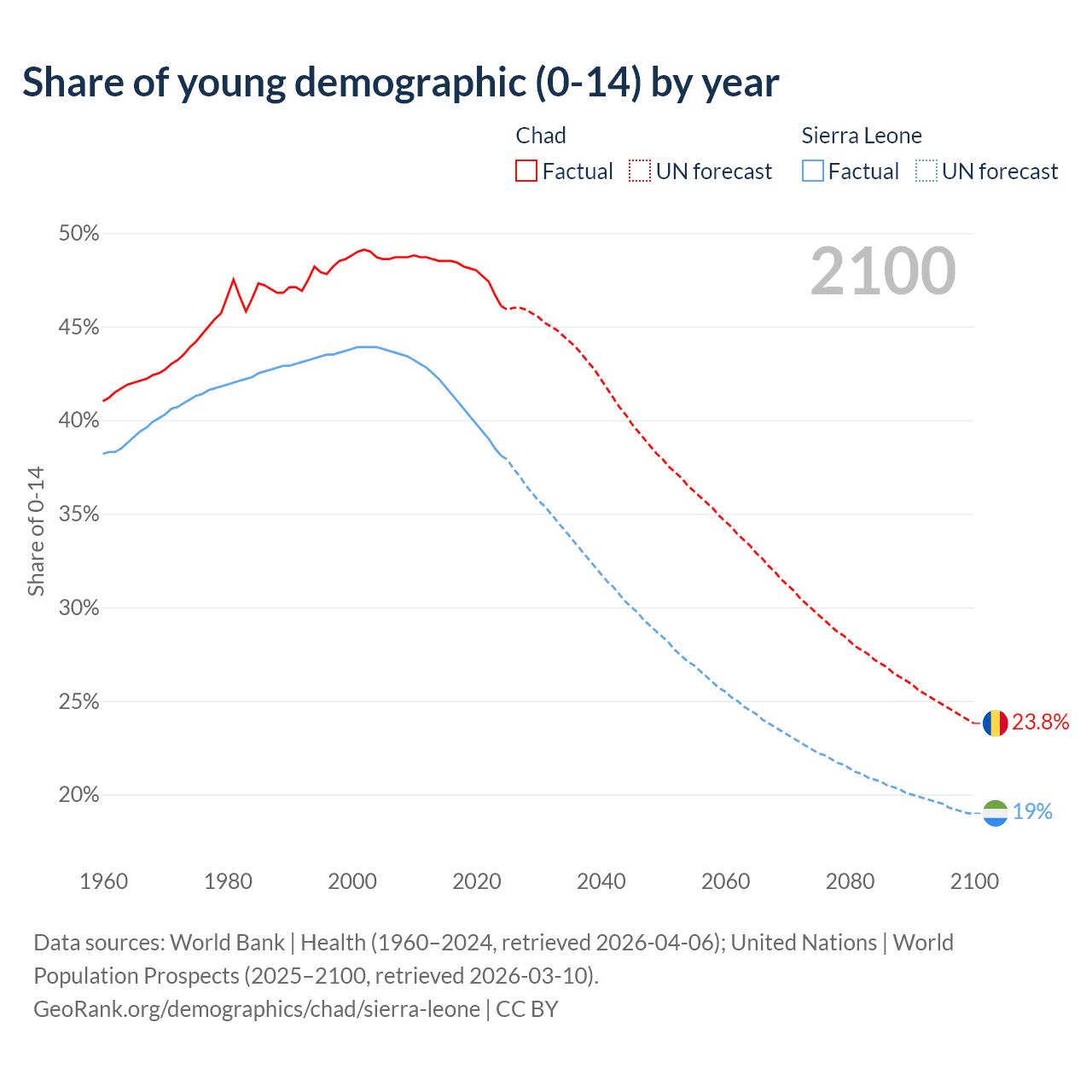 - The share of young demographic (0-15 years old) in Chad is 46.1% vs 38.1% in Sierra Leone.