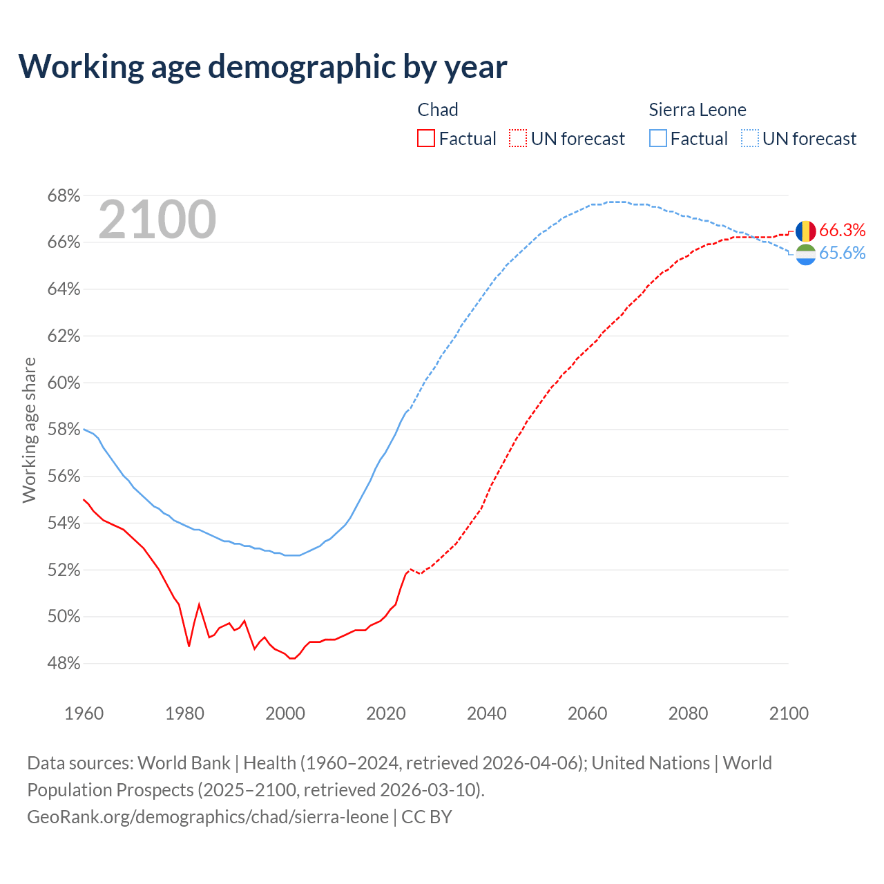 - Chad has 11.3M working age adults (aged 15-64) vs 5.31M in Sierra Leone.