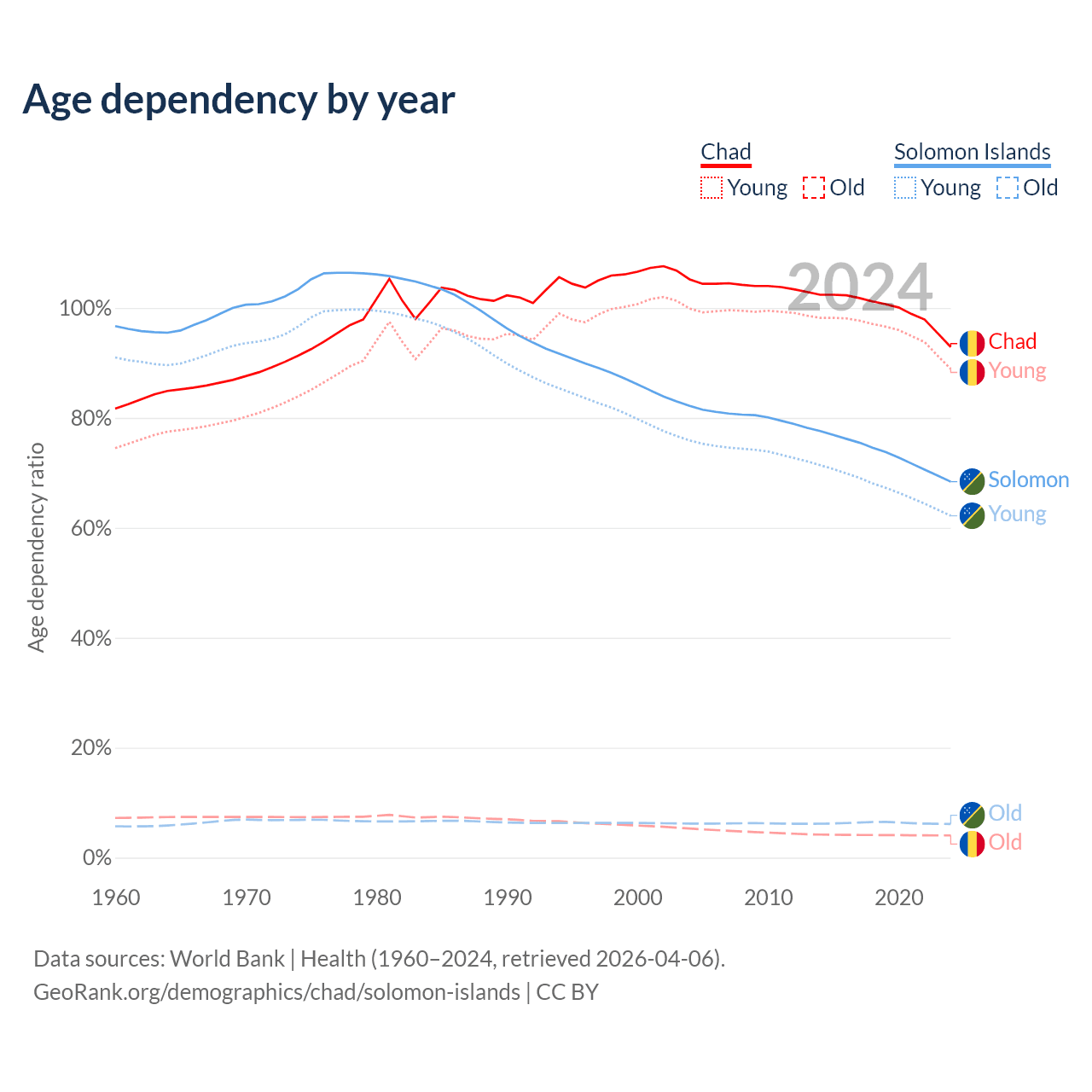 - Chad is ranked 192/196 by median age (oldest to youngest) vs 153/196 for the Solomon Islands.
