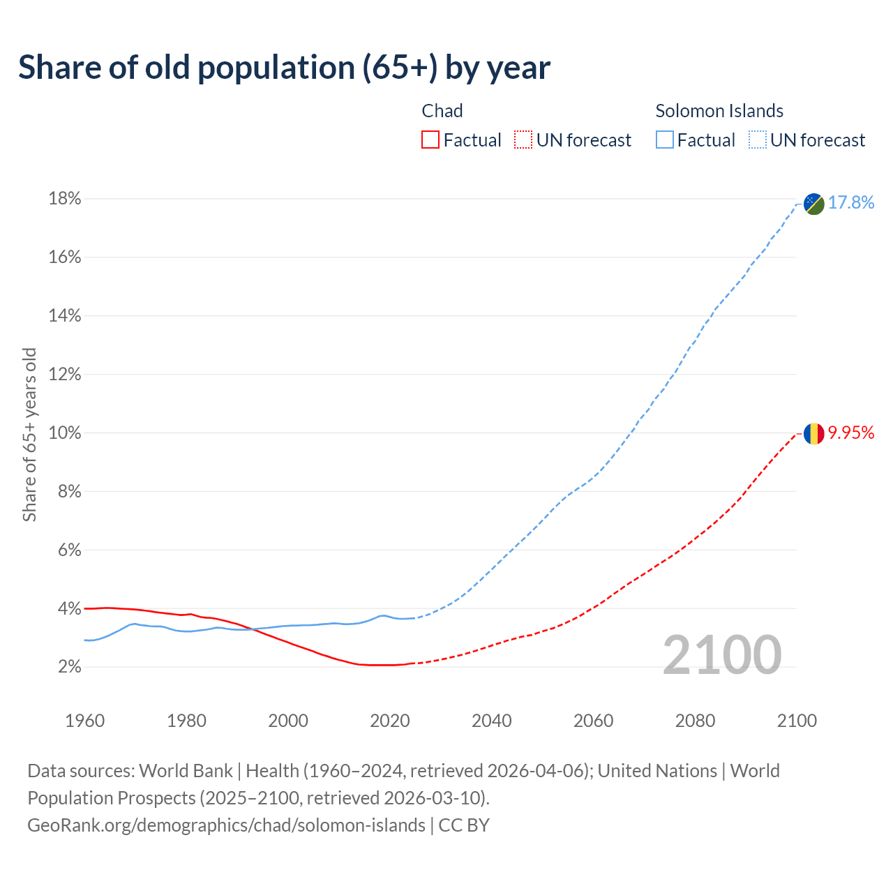 The share of older people aged 65 and over is 2.1% in Chad and 3.64% in the Solomon Islands. Life expectancy in Chad compared to the Solomon Islands .