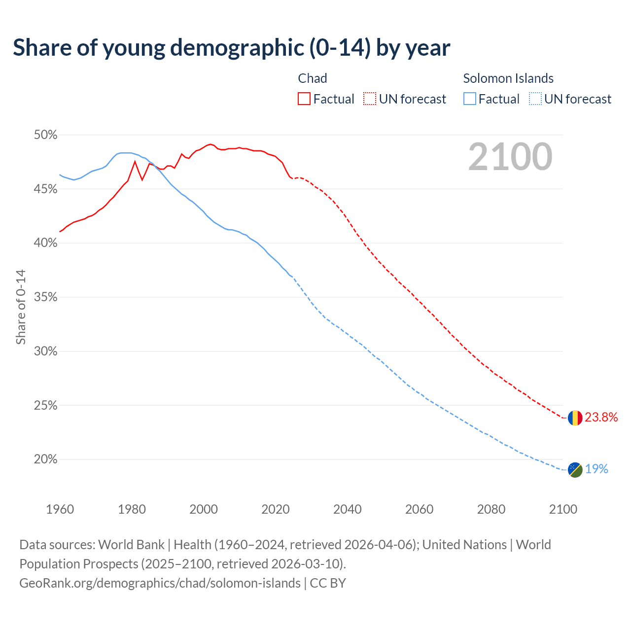 - The share of young demographic (0-15 years old) in Chad is 46.1% vs 37% in the Solomon Islands.