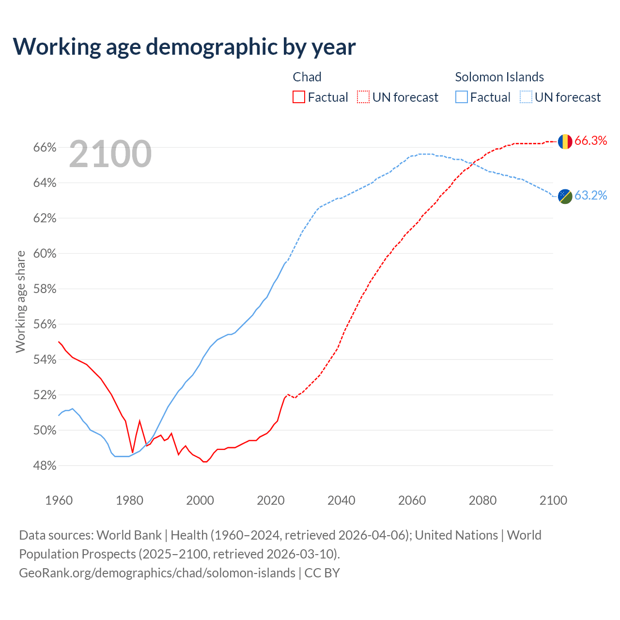 - Chad has 11.3M working age adults (aged 15-64) vs 513K in the Solomon Islands.