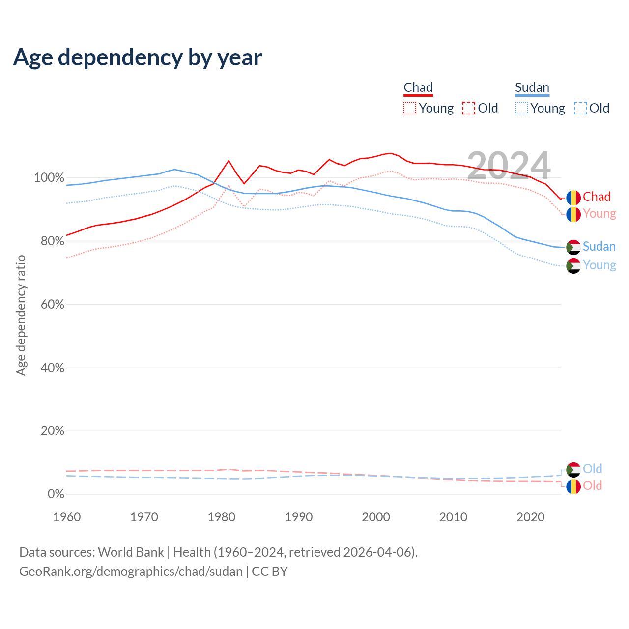 - Chad is ranked 192/196 by median age (oldest to youngest) vs 172/196 for Sudan.