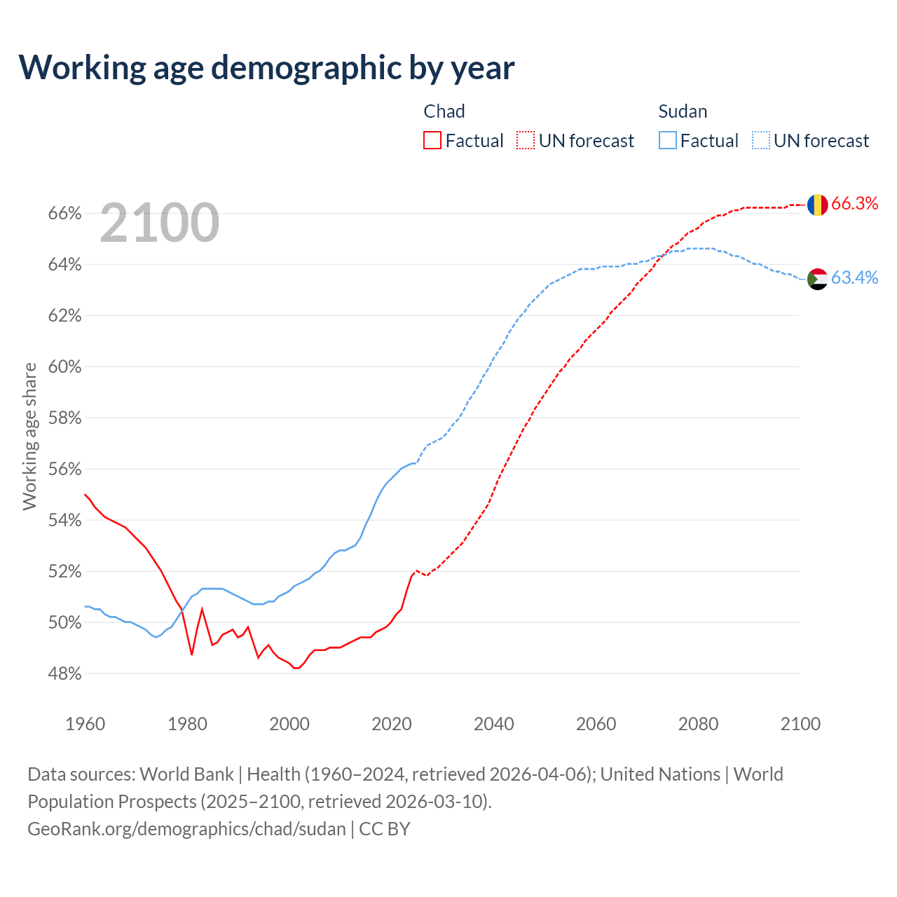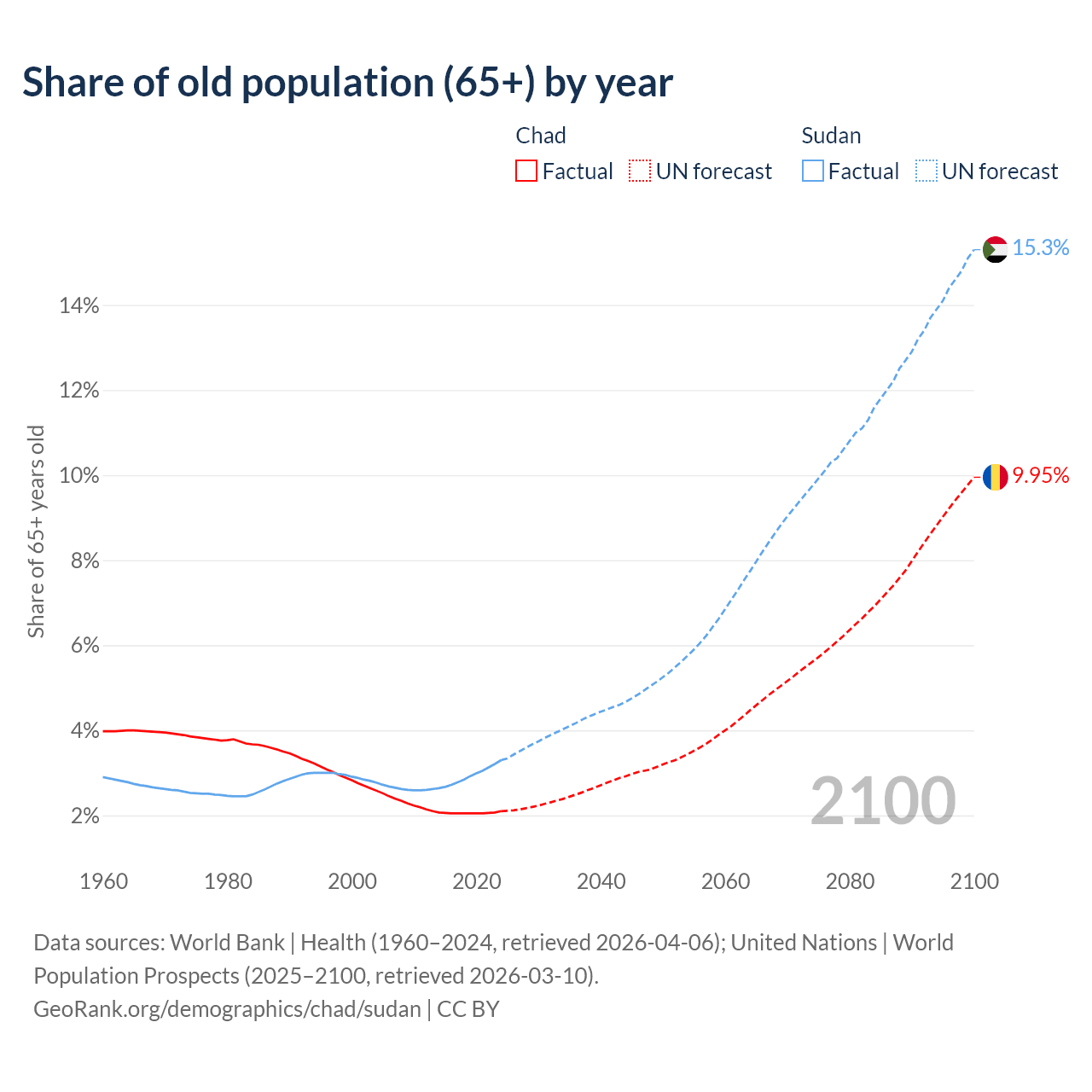 The share of older people aged 65 and over is 2.1% in Chad and 3.3% in Sudan. Life expectancy in Chad compared to Sudan .