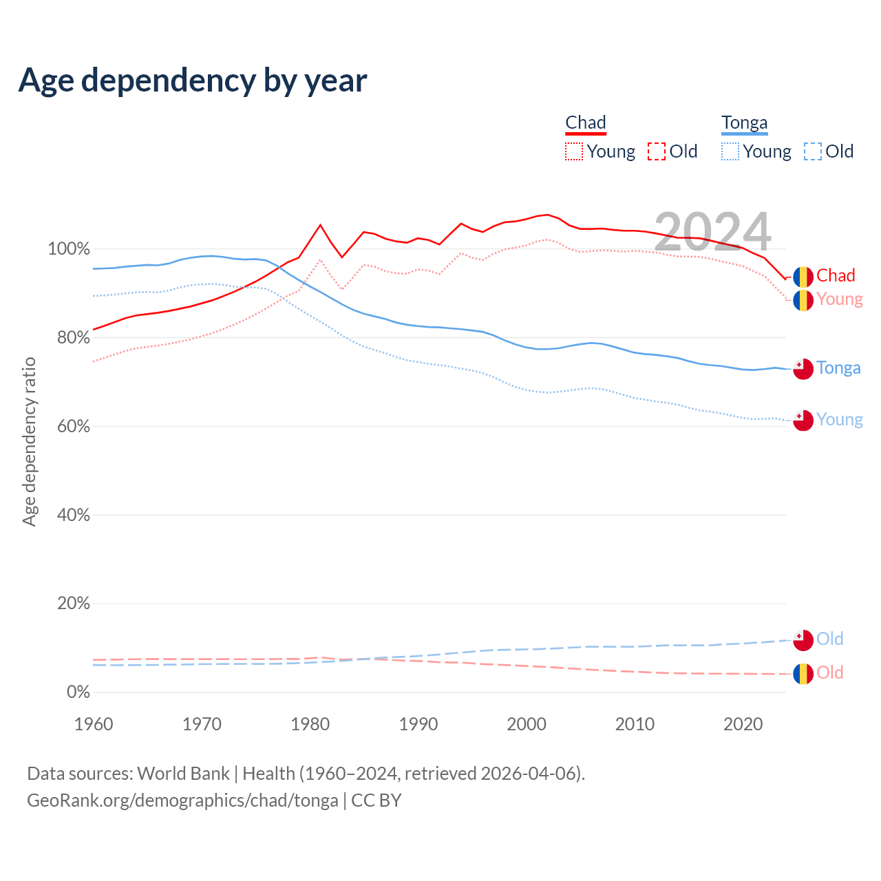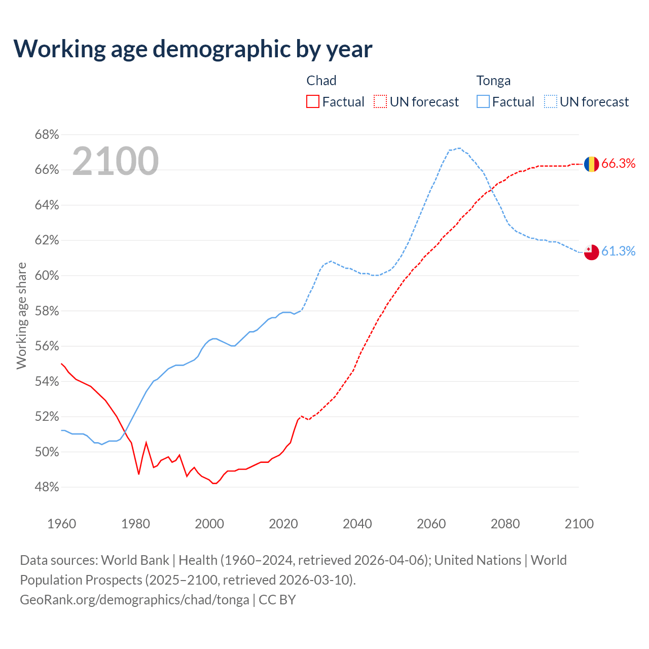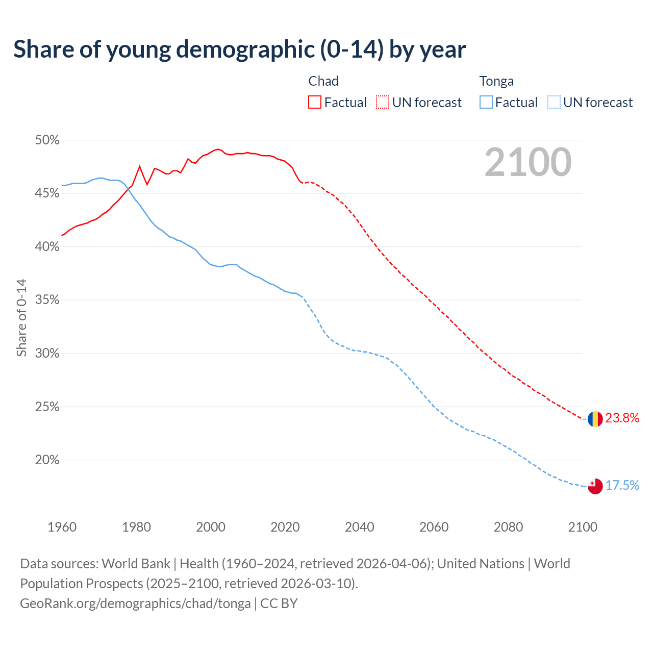 - The share of young demographic (0-15 years old) in Chad is 46.1% vs 35.4% in Tonga.