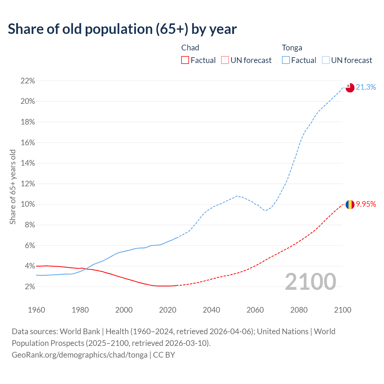 The share of older people aged 65 and over is 2.1% in Chad and 6.72% in Tonga. Life expectancy in Chad compared to Tonga .