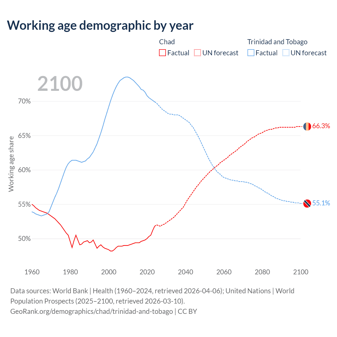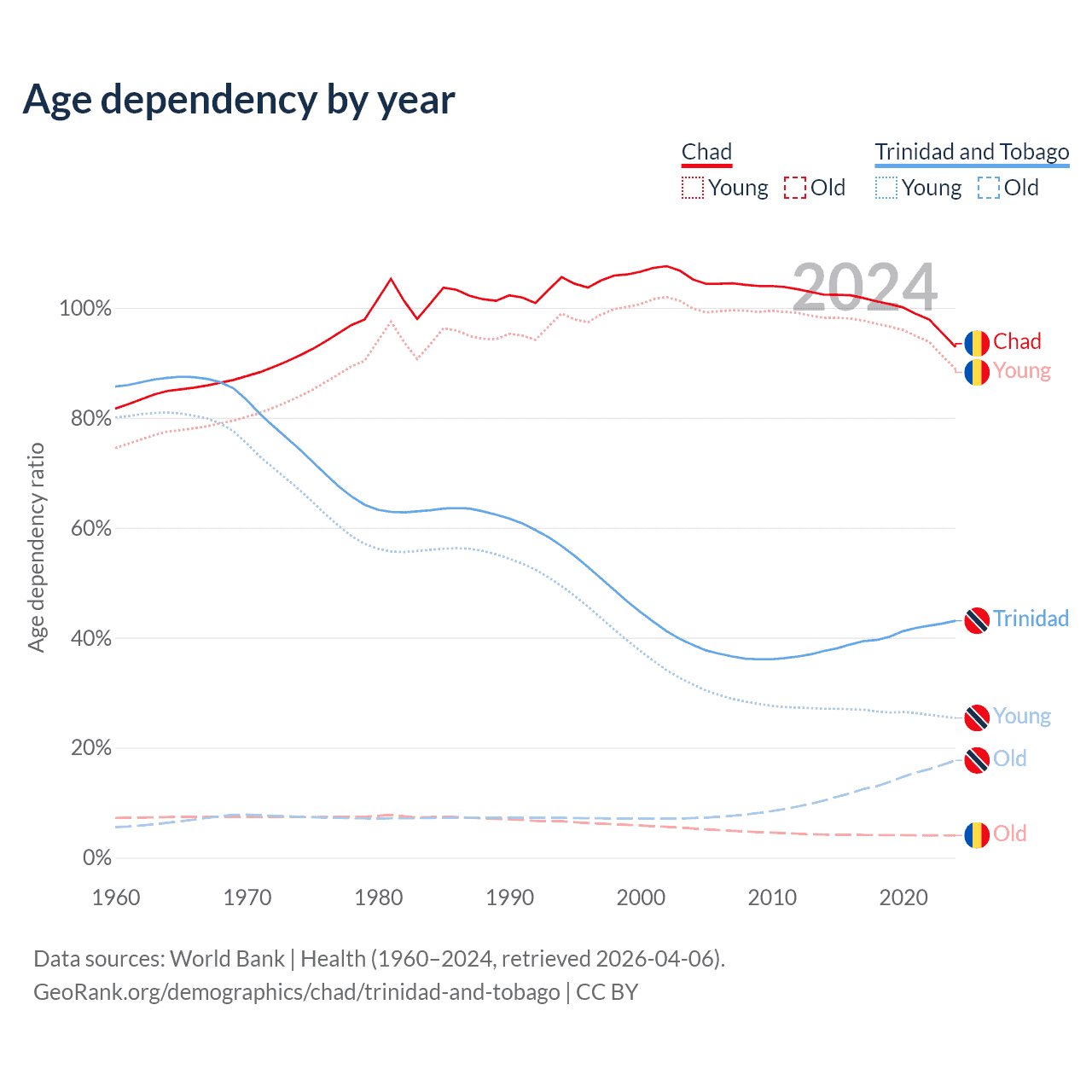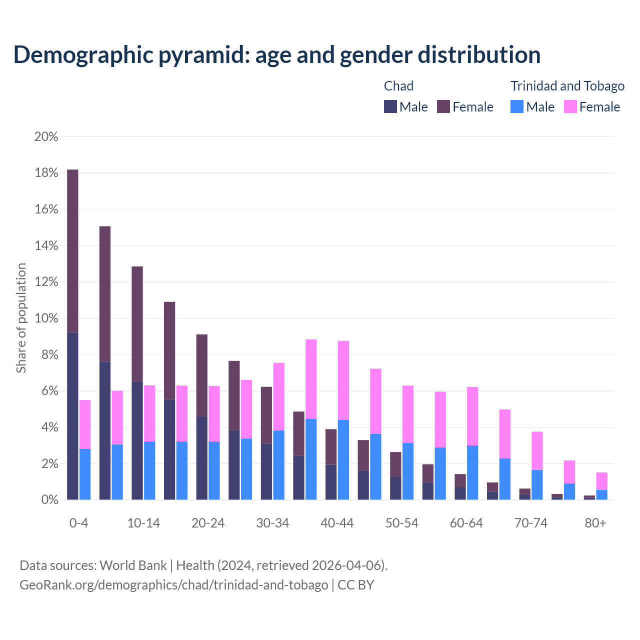 - The share of young demographic (0-15 years old) in Chad is 46.1% vs 17.8% in Trinidad and Tobago.