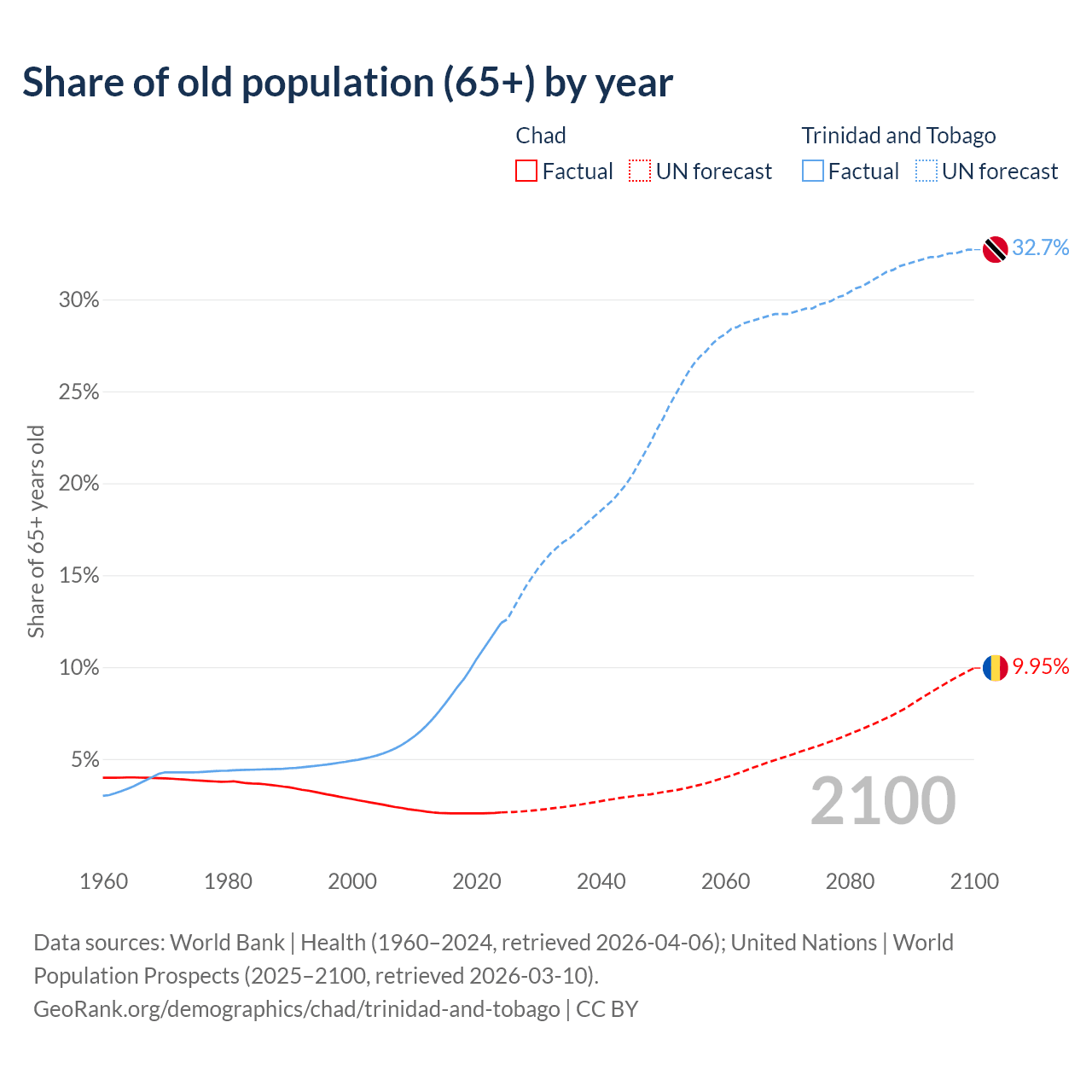The share of older people aged 65 and over is 2.1% in Chad and 12.4% in Trinidad and Tobago. Life expectancy in Chad compared to Trinidad and Tobago .